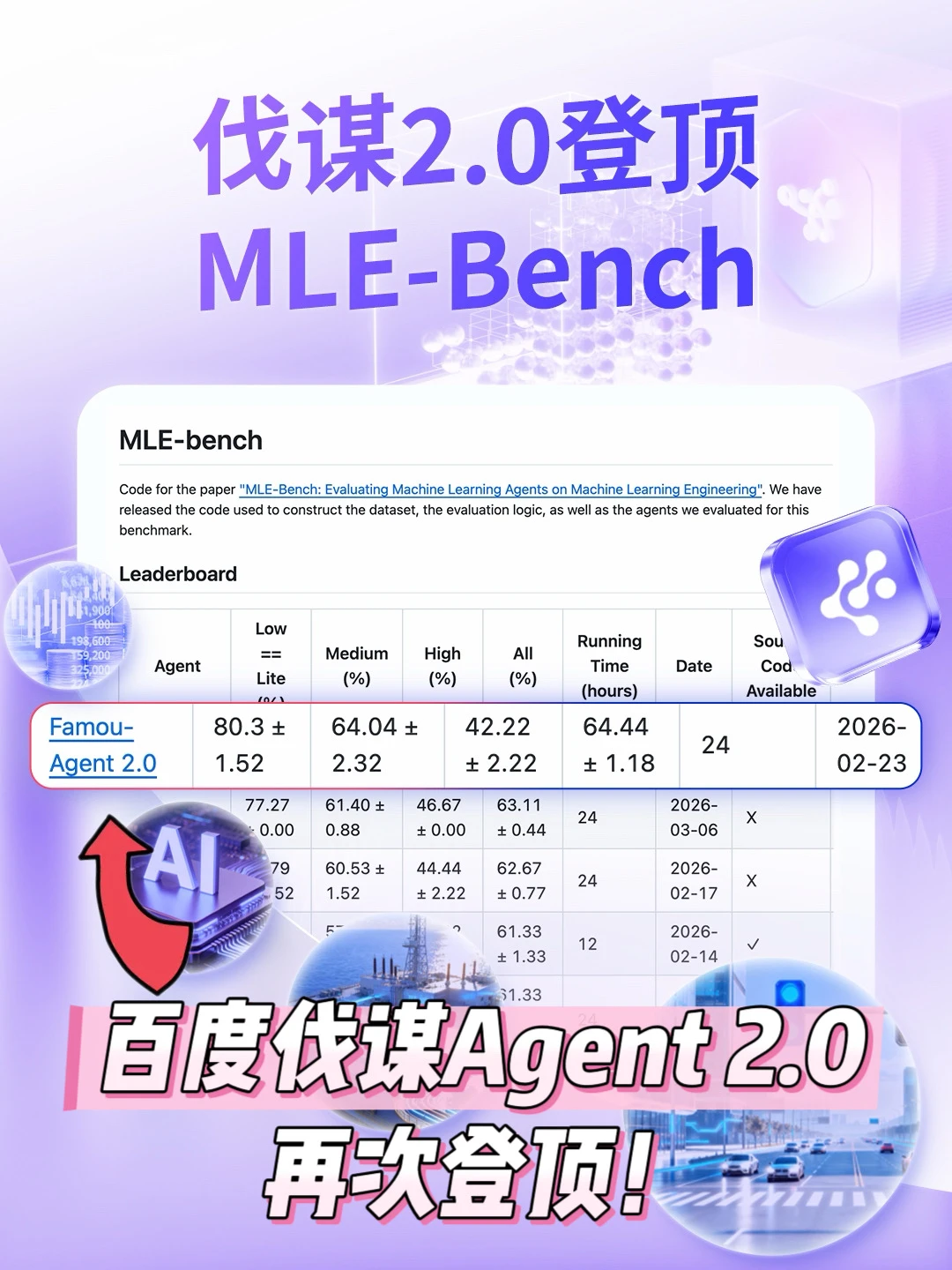 事情发生在OpenAI主导的MLE-Bench考试上。百度伐谋团队本来两度登顶,结果2026年2月被一家叫Disarray的创业公司反超。77分,近乎满分。