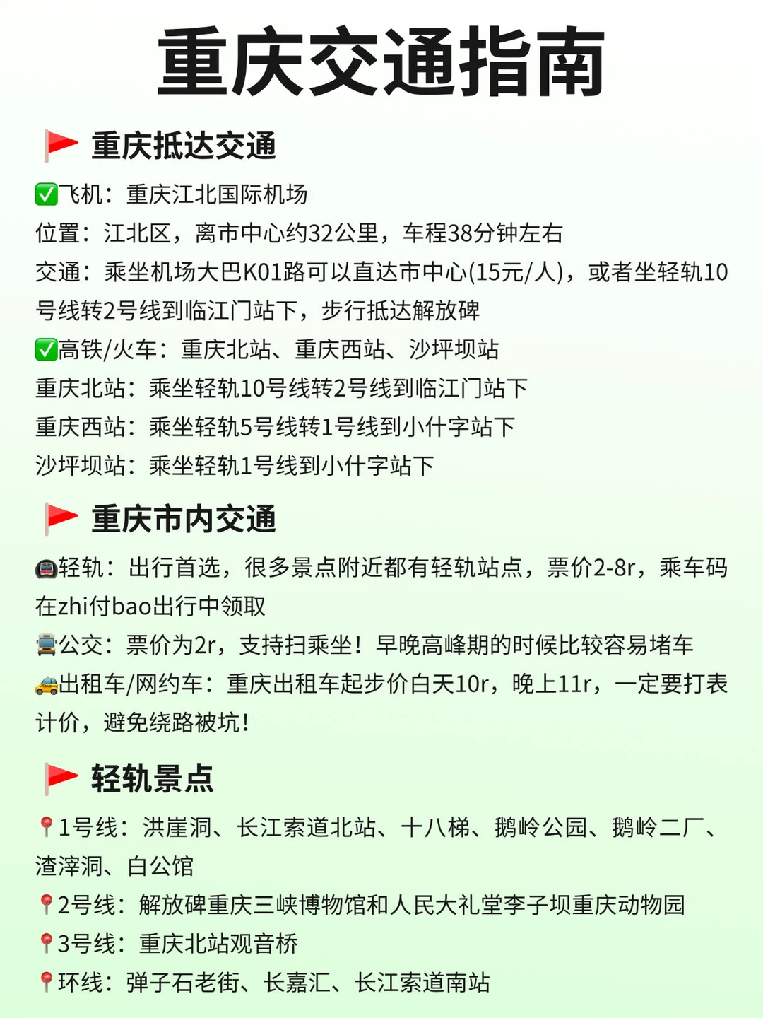 🚝市内交通:地铁覆盖90%景点(扫码乘车,超方便);网约车/出租车不贵,但早晚高峰慎选;特色长江索道/两江小渡,体验山城立体交通
