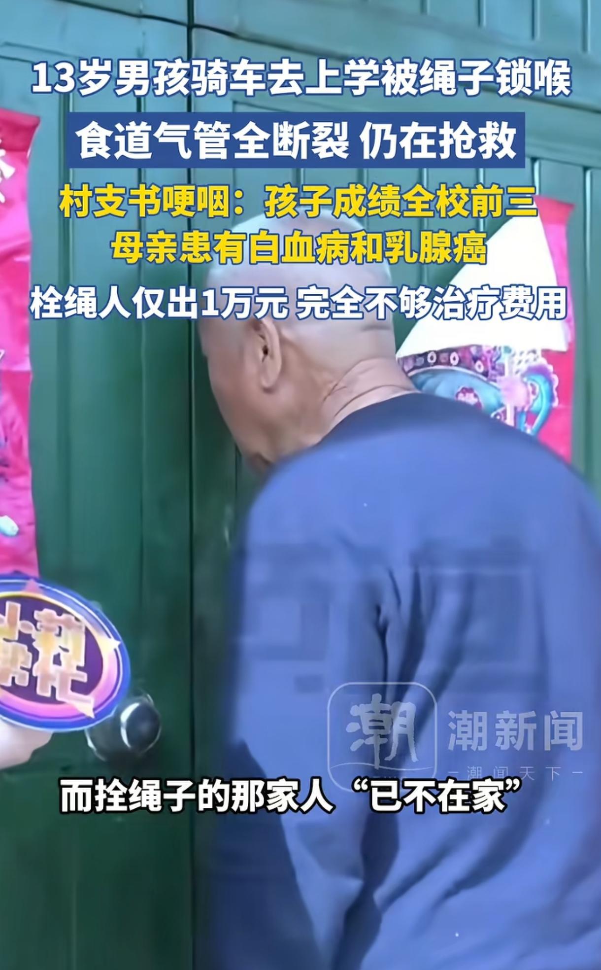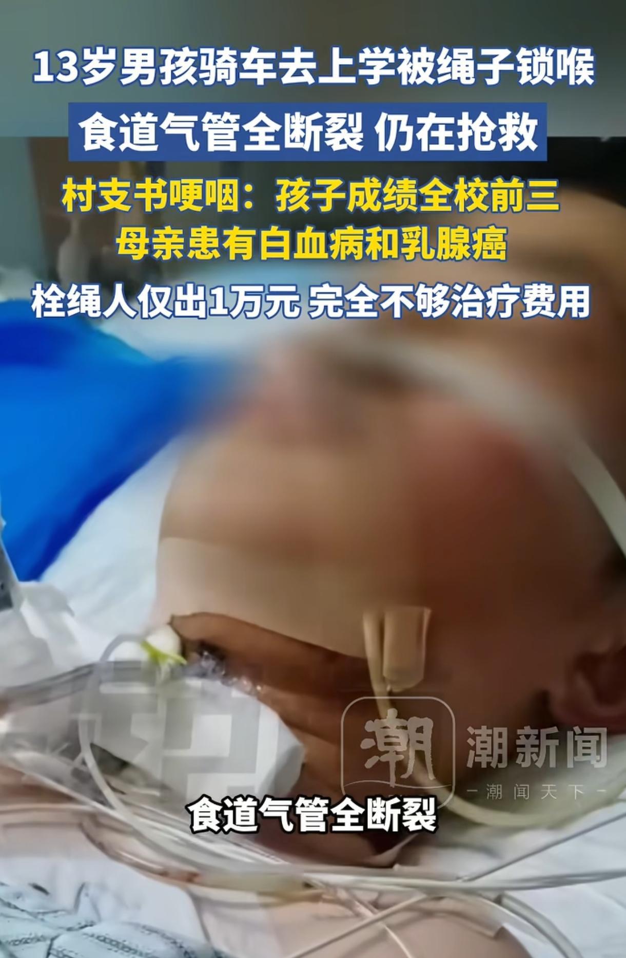 太可怜了。河南,一名13岁男孩骑自行车上学,被村道上一根绳子割破气管与食道,孩子强忍巨痛双手托着头回家求救,后紧急送医抢救住进ICU,生命危在旦夕! 一根看不见的绳子,卡在孩子的喉咙,一下子把一家人的生活掀翻了。 4月初,河南焦作的一个村子里,13岁男孩骑车去上学,骑到一段村道时,突然被一根横在路中的绳子拦住了,直接撞上去。绳子一头拴在树上,一头拴在电线杆上,颜色不显眼,周围也没警示,早晨光线又不好,很容易忽略。 冲击力极为猛烈,绳子恰好勒住男孩颈部,致使他连人带车一同翻倒。男孩脖颈勒出两道血痕,剧痛之下,当场便无法言语。他没有倒在地上,强忍着疼,双手托着头,拖着步子往家跑,这一路到底有多长,他自己最清楚。 返家之后,他仅能以指颈之态示意。家人见状,惊惶不已,即刻将他送往医院。而医生的诊断结果,如利刃般刺痛人心。 气管断裂、食道破裂,当下首要任务是保住性命,后续治疗再作考量。于ICU中,每一步皆如闯关,患者能否被成功救治,实难断言。 到4月12日,媒体报道这事已过去一周,孩子还在重症监护室,状态不稳定。 这不是一个调皮的孩子,平时懂事,学习也好,年级前三,是家里人的希望。可家里太难了,母亲一身病,白血病加乳腺癌,家里基本靠低保,平日都拮据,更别说烧钱的重症救治。 更令人痛心的是,引发这场灾祸的绳索,竟是村里一位老人为图打玉米、晾晒之便,擅自拉设的。这不经意之举,却酿就了如此悲剧。公共道路被拦了,没设反光,也没挂牌子,车一过就中招,这样的侥幸,靠什么撑着? 事故发生后,肇事者仅拿出一万元便销声匿迹。记者致电询问,对方径直挂断电话,其冷漠态度昭然若揭。 一条命,值不值1万元?还在ICU里的孩子,谁来负责接下来的治疗和护理?村里不是没做事,村支书发动大家捐了1万元,邻里也有爱心,但两万块,能撑多久?手术费、器械费、用药费、护理费,后期可能还要做修复,喂养要改,说不定要气管造口,这些账谁都算得清。 有人问,人抓住了没有?该不该追究?这是所有人关心的方向。 追根究底,此非天灾,实为人祸。公共道路并非私人庭院,任何人都无权肆意拉绳拦路,这是对公共秩序的漠视,亦是对大众权益的侵犯。法律上,私设障碍导致他人重伤,涉嫌违法,属于过失致人重伤的范畴,不止要赔钱,还可能要承担刑责。 年纪大,不是挡箭牌,乡里乡亲要讲情,但不是这么个讲法,讲情要在不伤人的前提下。不少网友说,这哪是意外,简直像谋杀,话重,但情绪可以理解,孩子就这么被撞上了,谁不怒。不过,情绪归情绪,流程要走,证据要查清,赔偿要落实,法律该怎么判就怎么判。 这事刺痛人的,还有孩子回家的那一段,他托着头走路的样子,一直在很多人的脑子里晃。母亲病着身子,哭着说,只要孩子能好,让她干什么都行,医生回应,会尽全力。医生尽力是一方面,欠着的治疗费是另一面,现实是冰冷的,救治不能等,费用也不能拖。 更值得注意的是,这样的危险并不是个案,不少地方为图省事,会在路上晾晒、拉线、拦道,侥幸心理一旦酿祸,受伤的往往是路过的人。 村里有没有张贴过提示?有没有劝阻?有没有巡查?这些问题,今天不回答,明天还会回来。 谁来给农村道路立规矩?谁来盯着执行?村规民约不是摆设,公共安全也不是口号。 有人说,赔不起怎么办?问题在于,不是赔不赔得起,是该不该把路拦上,出了事就要承担后果,别再拿穷说事。如果有保险,能不能报销?如果没有,能不能协调救助?这些都需要当地部门出面,尽快给出方案。 孩子前面的路也许很长,喝水吃饭都可能要重新训练,说话发声也可能要慢慢来,别把“过失”三个字当成挡箭牌。 这一次,大家都盯着,盯着孩子的病情,盯着赔偿的进度,盯着法律的走向,也盯着村里该做的事。 信息来源:河南13岁男孩骑车被一条绳子锁喉,正在ICU抢救,当地村支书回应——小莉帮忙
