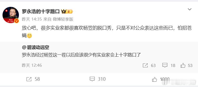 罗永浩:很多实业家都很喜欢杨笠的脱口秀,只是不对公众表达这些而已,怕招苍蝇
