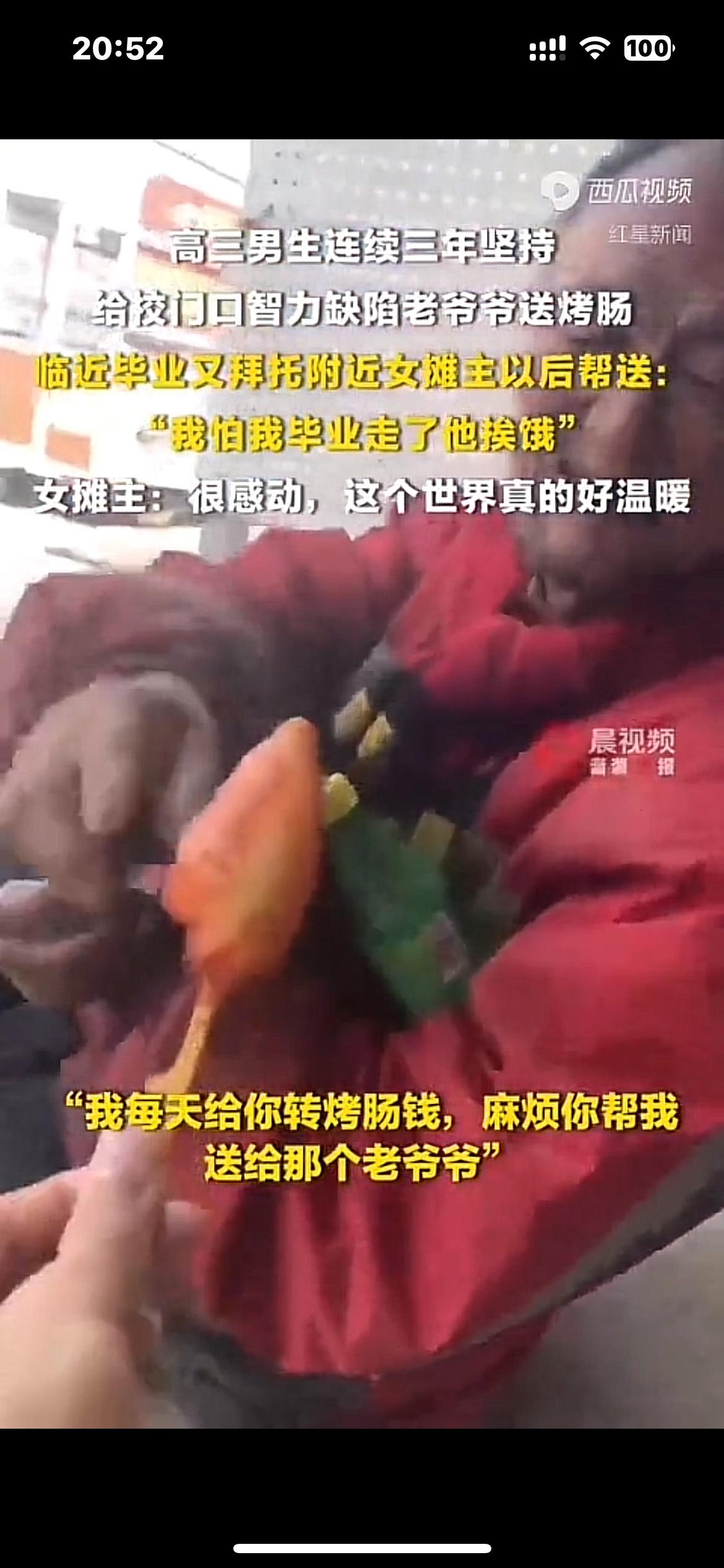 生连续3年给校门口智力缺陷老人送烤肠,临近毕业拜托附近女摊主帮送,摊主:很感动,不会收他的钱 近日,山东潍坊,高三男生连续三年坚持给校门口有智力缺陷的老爷爷送烤肠,临近毕业又拜托附近女摊主以后帮送:“我每天给你转烤肠钱,麻烦你帮我送给那个老爷爷,我怕我毕业走了他会挨饿。”女摊主管女士告诉潇湘晨报记者:“很感动,这个世界真的好温暖。” 这桩小事如涟漪荡开,却让无数人心头一颤。高三男生王浩(化名)的善意绝非偶然——他每日放学必经校门,总见老人蜷缩在角落,眼神懵懂,衣衫褴褛。起初只是同情,可当他某日试探性递上一根烤肠,老人咧嘴一笑的瞬间,某种羁绊悄然生根。三年间,无论烈日寒风,他总在固定摊位买两根烤肠,一根自己解馋,一根递给老人。有时赶时间,他便将烤肠托给摊主代送,摊主们知晓原委后,竟自发加入“接力”:管女士的烤肠摊、隔壁卖豆浆的大叔、修车铺的老伯……众人默契地“多备一份”,生怕老人饿着。王浩的“坚持”背后,是一张由普通人织就的温情网。 有人惊叹于少年心性之纯,却鲜少追问:这份善意为何能绵延三年?答案或许藏在细节里。王浩曾说:“老人每次接过烤肠都会嘟囔‘肉肉,香’,像孩子般开心。”正是这种朴素的反馈,让他在学业压力下仍不忘履行“约定”。更关键的是,他深知个体力量的局限——临近毕业,他焦虑的不是离别,而是老人的下一餐。拜托管女士时,他连转账细节都想周全,甚至悄悄观察过摊主为人,确认其可靠才托付。这份深思熟虑的善意,远比冲动施舍更珍贵。 然而,当全网为“暖新闻”点赞时,我们是否该追问:一位智力缺陷的老人,为何长期独居校门口?社区救助体系何在?若没有王浩和摊主们的“偶然慈悲”,他的生存是否堪忧?这恰是事件折射的冰冷现实——社会对弱势群体的保障仍有裂隙。老人如浮萍般漂泊,恰因制度关怀的缺席,才让个体的善意显得格外耀眼。王浩的烤肠或许能填一时之饥,但长效解困仍需社会织就安全网:民政部门的定期探访、街坊邻里的互助登记、公益组织的资源对接……唯有将“偶然温暖”转化为“必然保障”,才能让善意不因某个人的离开而中断。 管女士拒绝转账的举动,亦藏着深意。她坦言:“收钱就变味了,这老爷子值得咱搭把手。”此言道破善意的本质——它不应被量化成交易,而是人与人最原始的联结。当摊主们自发延续王浩的“任务”,当网友留言“愿接力传递”,我们看见善意如何突破时空,形成流动的链条。有趣的是,这场善举甚至影响了老人:他曾被路人嫌弃“脏乱”,如今常有学生绕路送零食,商户递热水。善意如春风化雨,悄然重塑了周遭的温度。 王浩的毕业不是终点,而是善意的接力棒传递。他留下的不仅是烤肠,更是对社会的叩问:我们能否将“一个人的三年”变成“一群人的日常”?当个体光芒照亮制度暗角,或许才是文明进步的契机。那些质疑“作秀”的杂音不妨反思:若人人皆以“持久微小”的善意践行责任,世界岂非更好? 各位读者你们怎么看?若你身边也有需要帮扶的弱势者,会否如王浩般日复一日伸出援手?欢迎在评论区讨论。