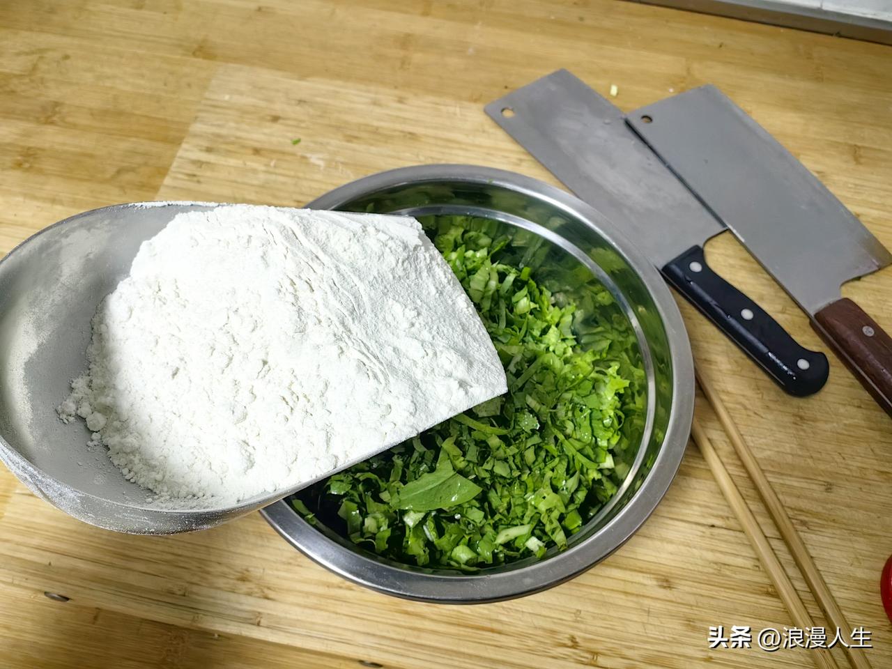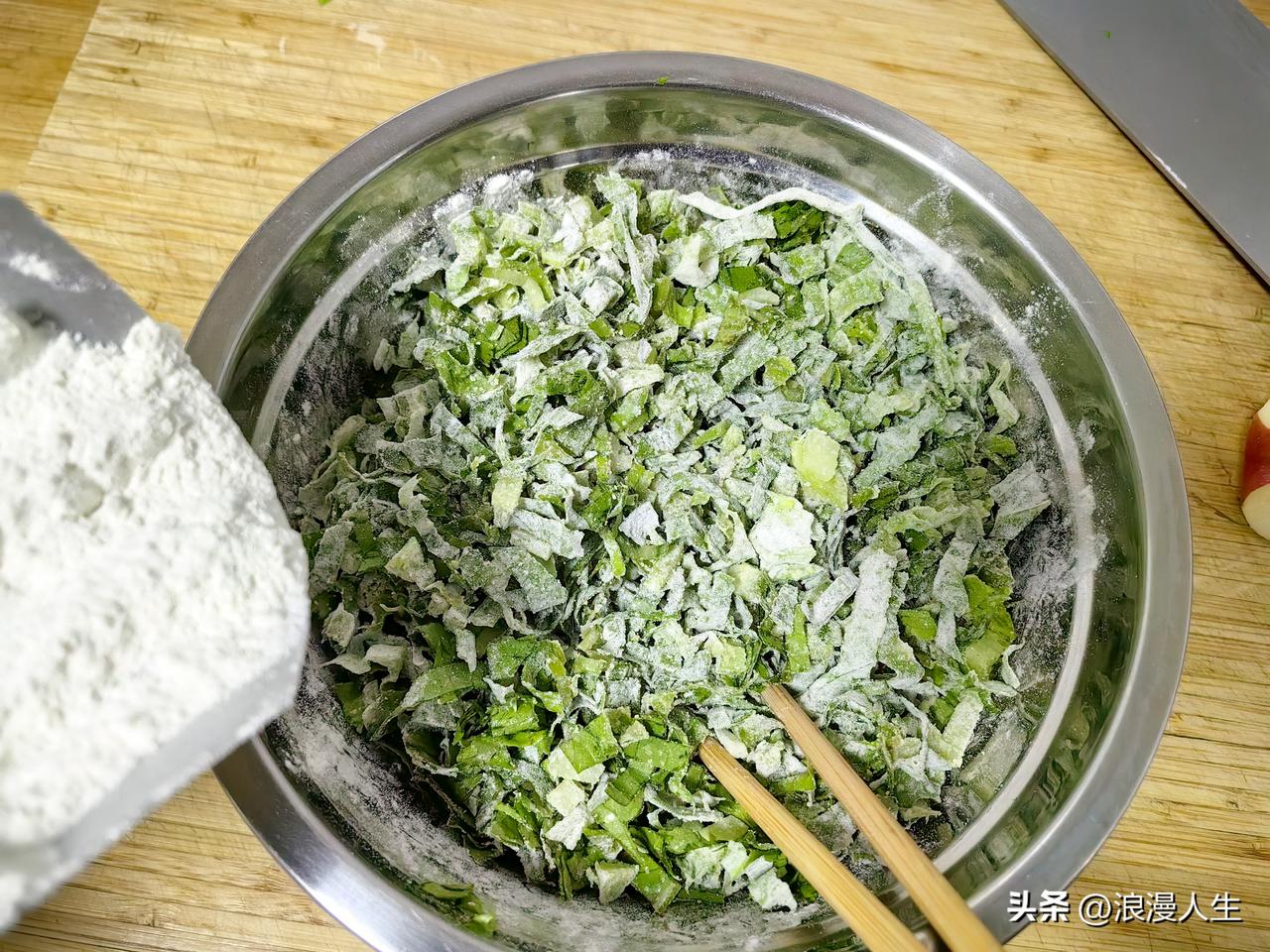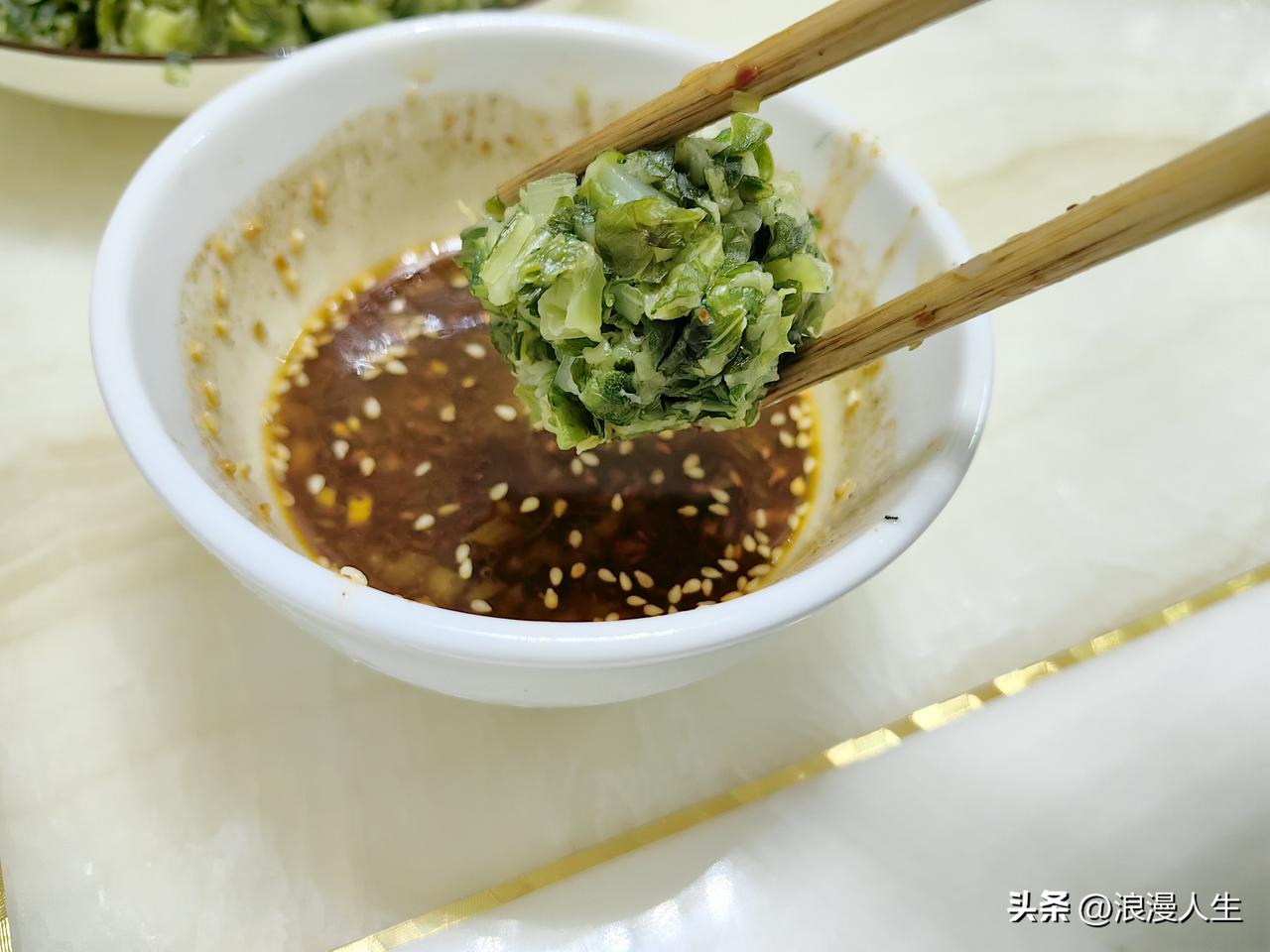 科技改变生活,知识改变命运。想吃菜疙瘩,不会做,打开手机搜索菜疙瘩制作教程,一分钟OK。 买来油麦菜清洗干净,切小段,再用刀剁碎,倒入盆中放少许碱面,面粉每次少量不断添加,搅拌均匀后,捏成小团儿放蒸锅13分钟后,毫无悬念的成功。 料汁:蒜苗切小丁,放入花椒粉,盐,味精、辣椒面,起锅烧油,煎油泼料汁,加入酱油醋搅拌均匀,刚出过的菜疙瘩蘸料汁送入口中,人生如此、夫复何求!