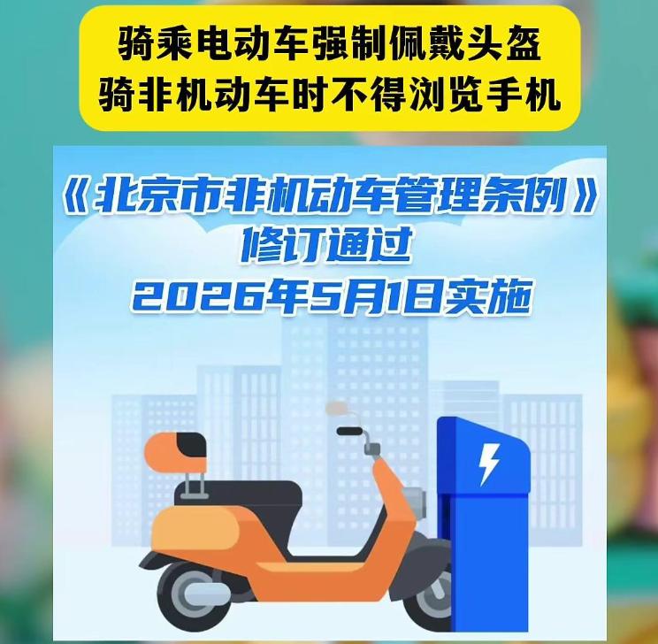 紧急提醒!5月1日起,新修订的《北京市非机动车管理条例》正式落地,不只有罚则,还有不少实在利好,看完直接避坑不白跑! 以前骑电动车只能带12岁以下的娃,现在直接放宽到16岁以下!家里有初中生的家长,终于不用再绕路接送、多跑一趟了,太省心! 电动车行驶证、号牌,有效期直接延长到10年,期满还能申请延用,而且能办电子行驶证,手机一出示就管用,再也不用怕忘带实体证被查啦! 但这3个细节,大家可千万别大意,一不小心就踩雷 ❌ 头盔可不是随便戴就行,必须得是3C认证的,普通头盔不算数,查到直接罚10-50元,别抱侥幸! ❌ 骑车的时候别刷视频、别手持接打电话,哪怕低头看一眼消息都不行,违规就罚20元,安全真的别大意! ❌ 电动车电池绝对不能带进住宅楼,充电也得用合规设施,违规最高罚200元,可别拿自己和邻居的安全赌侥幸! 新规既有便利也有约束,每一条都关乎咱们骑行者的安全和权益,赶紧转发给身边骑电动车的朋友,一起守规矩、不踩坑、享便利~