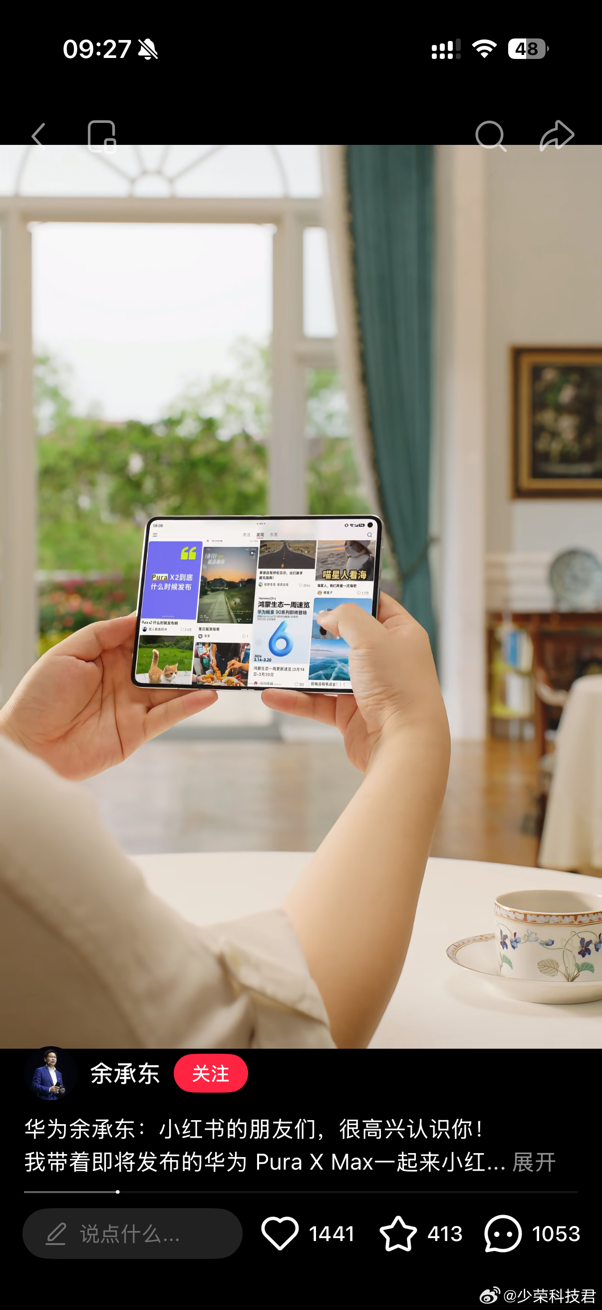 余承东入驻小红书,发布的第一条视频居然是HUAWEI Pura X Max真机展示,4月20日上。