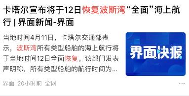 波斯湾突然通航,不是风和日丽,是暴风雨前的平静 4月12日,卡塔尔交通部正式宣布:波斯湾所有类型船舶的海上航行全面恢复,每日通行时间为上午6点到下午6点。此前航运停了一个多月,几千艘船堵在海上。消息一出,油价应声大跌。有分析预测,随着海峡重新开放,油价有望在月内继续下滑。 突然让通航,更像是伊朗的一张战术牌。 伊朗选择在美伊谈判破裂、美军即将封锁霍尔木兹海峡的前一天(4月11日)宣布恢复通行。时间点很巧妙。表面是让步,实则是在美军正式封锁前,抢先打通航道,这样就能够占领舆论高地。目的很明确:让外界看到,真正封锁海峡的不是伊朗,而是即将动手的美国。毕竟,伊朗革命卫队始终强调,海峡“处于管控之下”。伊朗的意思不就是现在可以通航,不代表一直可以。到时候若是美国继续侵略,伊朗估计会再次封锁海峡,到时候,世界都会指责美国,那么美国该怎么,面对伊朗这阳谋。 还有就是航运真的能恢复吗?有一个最致命的隐患:水雷。伊朗之前在海峡布了水雷,现在连自己都找不到具体位置。美国官员直言,伊朗无法定位所有水雷,也缺乏清除能力。美军已开始扫雷部署,但这一过程本身就伴随着极高风险。 卡塔尔只宣布“恢复通行”,却没解决“水下还有雷”这个根本问题。如果真的有船撞上,那通航就是个笑话。说到底,波斯湾突然通航,表面看是航运秩序的恢复,实际上是美伊对峙进入新阶段的信号。
