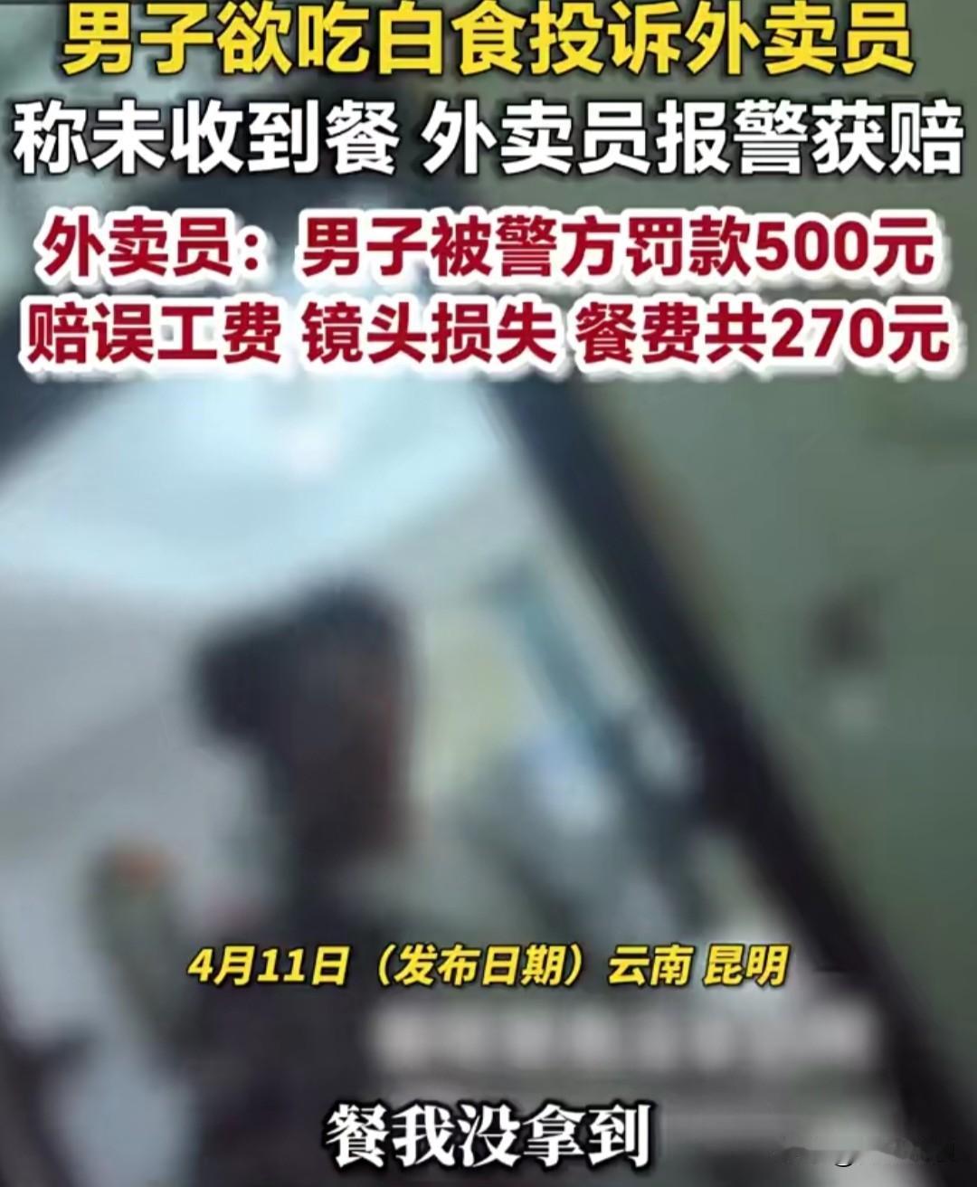 昆明男子吃完外卖谎称没收到,还动手倒打一耙,结局大快人心! 近日云南昆明曝出一桩离谱事:一名男子点外卖安心吃完,转头就恶意申请退款,谎称自己压根没收到餐品。外卖员察觉不对劲折返核对,当场发现空餐盒摆在原地,谎言瞬间被戳穿。 没想到男子丝毫不知羞愧,反倒恶人先告状,投诉餐品被动过手脚,还动手推搡外卖员,直接砸坏对方随身记录仪,态度蛮横又嚣张。 好在证据确凿、公道在线,警方介入查实全部经过,最终对这名恶意吃白食的男子罚款500元,还需赔付外卖员各项损失几百元,为自己的贪小便宜付出了代价。 做人格局不能这么小,几块钱的外卖而已,非要耍无赖、欺负辛苦跑腿的打工人,既丢人品又破财,真是得不偿失。大家身边遇见过这种吃白食还蛮横不讲理的人吗?评论区聊聊!