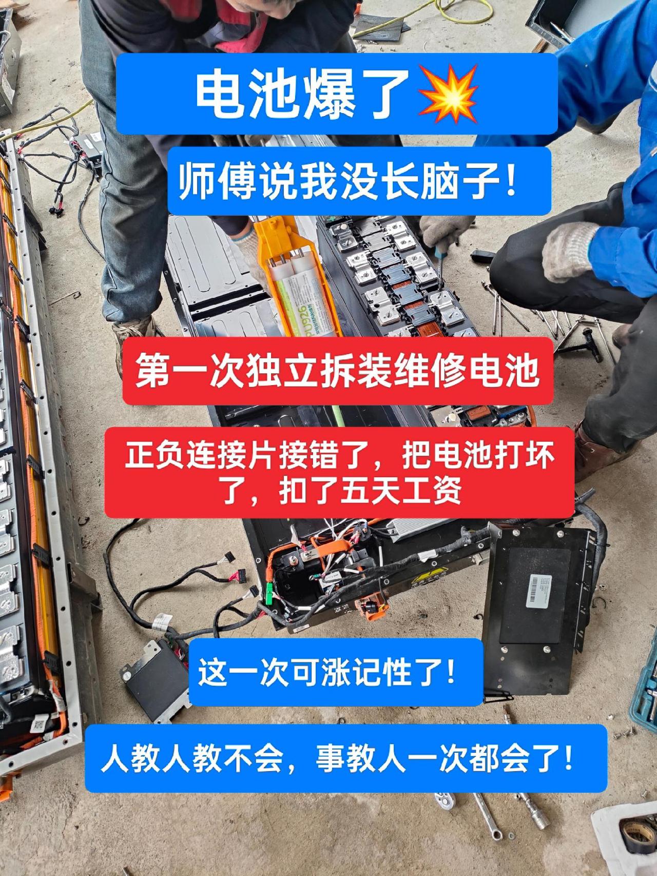 第一次修电池,正负极接错了,把电池打坏了,赔了一千块,师傅说我上班没带脑子,这次可涨记性了!