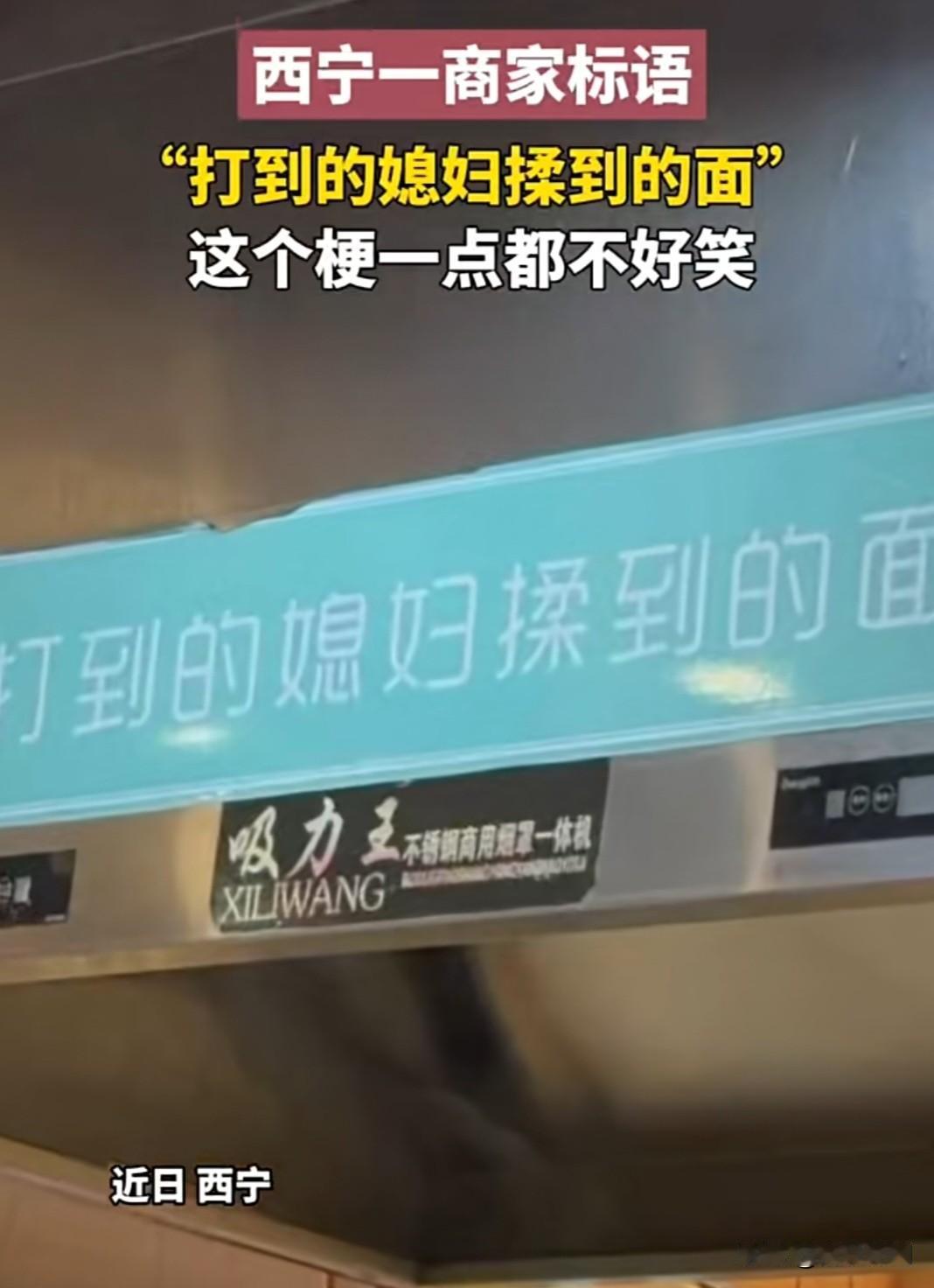 青海西宁一家面馆悬挂“打到的媳妇揉到的面”标语,瞬间引爆舆论。这句西北民间俗语,把家暴与揉面强行类比,暗示妻子越打越温顺、面团越揉越筋道,公然美化暴力、冒犯女性,引发全网批评。 商家或许想博眼球、贴乡土标签,但家暴是违法犯罪,绝非玩笑。把侮辱女性、纵容暴力的陈腐观念当营销文案,不仅拉低店铺格调,更传递错误价值观。不少网友直言:面可以揉,人绝不能打,老糟粕必须摒弃。 目前监管已介入要求撤下标语。俗语有地域属性,但善恶不分地域。尊重他人、敬畏法律,才是长久经营的底线。 大家觉得这是民俗玩笑还是性别歧视?遇到类似低俗标语你会举报吗?