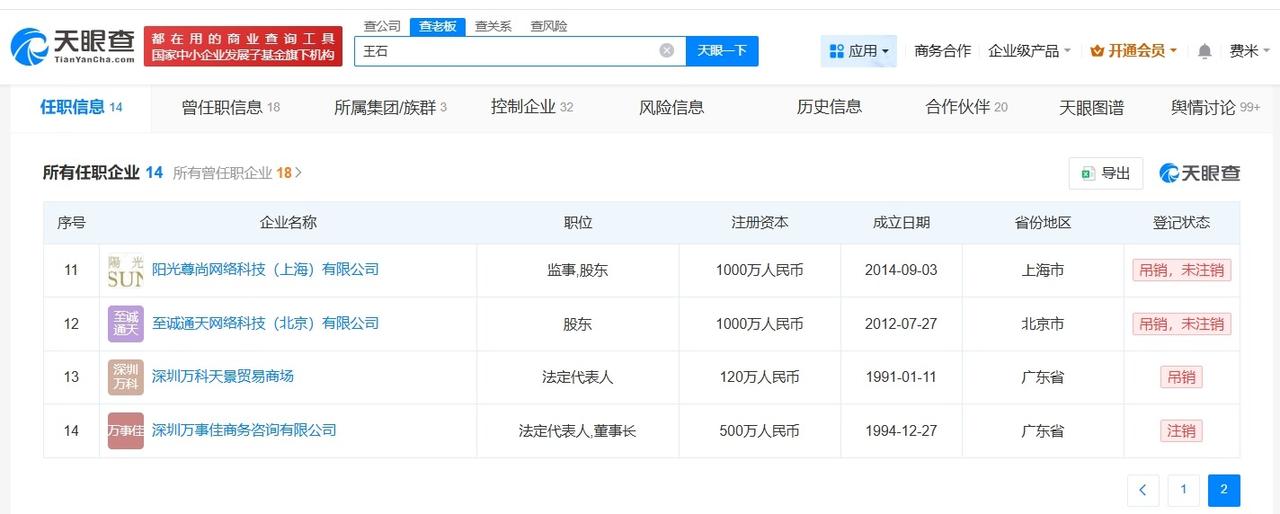 盘点王石商业版图 王石名下关联10余家企业王石否认被抓 据媒体报道,4月12日下午,“王石被抓”的消息突然刷屏。随后,王石和其妻子田朴珺均发文回应,相关话题引发热议。 天眼查App显示,王石名下关联10余家企业,其中10家处于存续或者正常状态,包括启城绿色科技(深圳)集团有限公司、深石管理咨询(深圳)有限公司、深石(北京)私募基金管理有限公司等,王石在上述企业担任董事长、董事等职务。 天眼查信息:-c3157683056