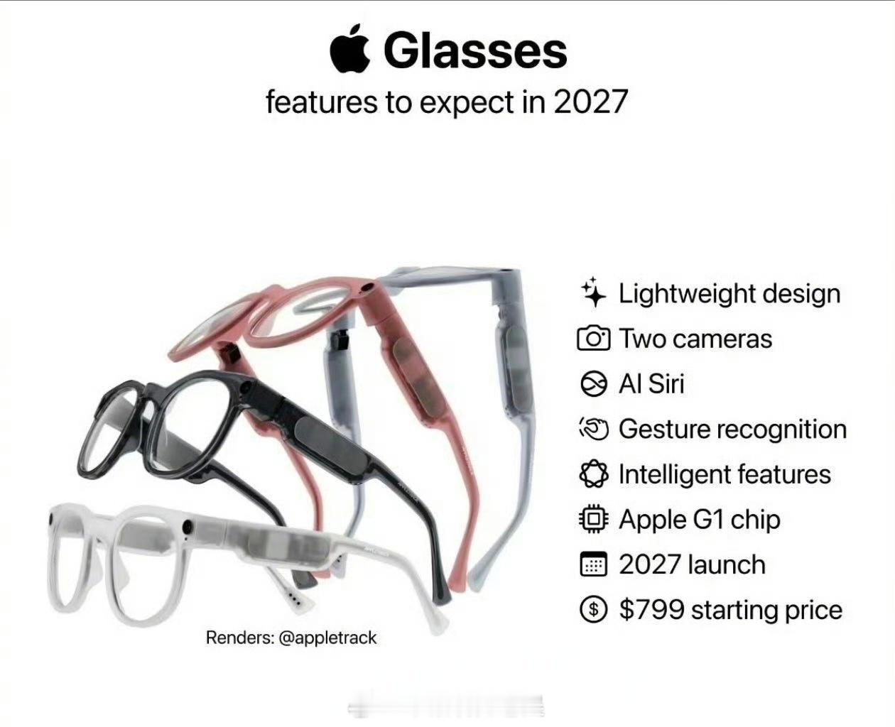 苹果AI眼镜细节曝光彭博社古尔曼爆料,苹果AI眼镜项目代号N50,四款框型、多种配色、竖向椭圆摄像头,2027年上市,价格预计499美元起。