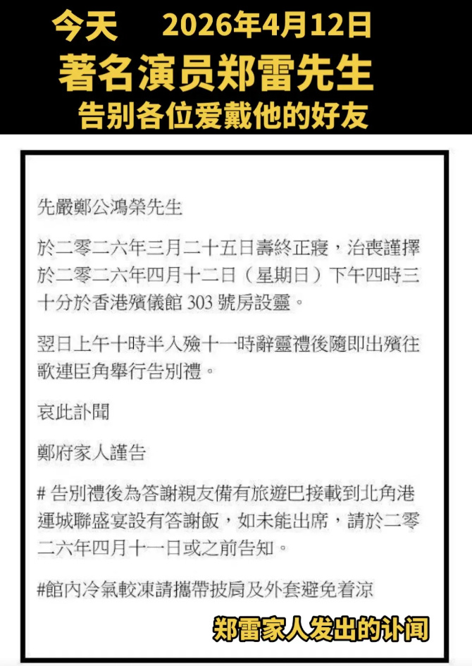 3月25日,香港资深演员郑雷(原名郑鸿荣)安详离世,享年82岁。