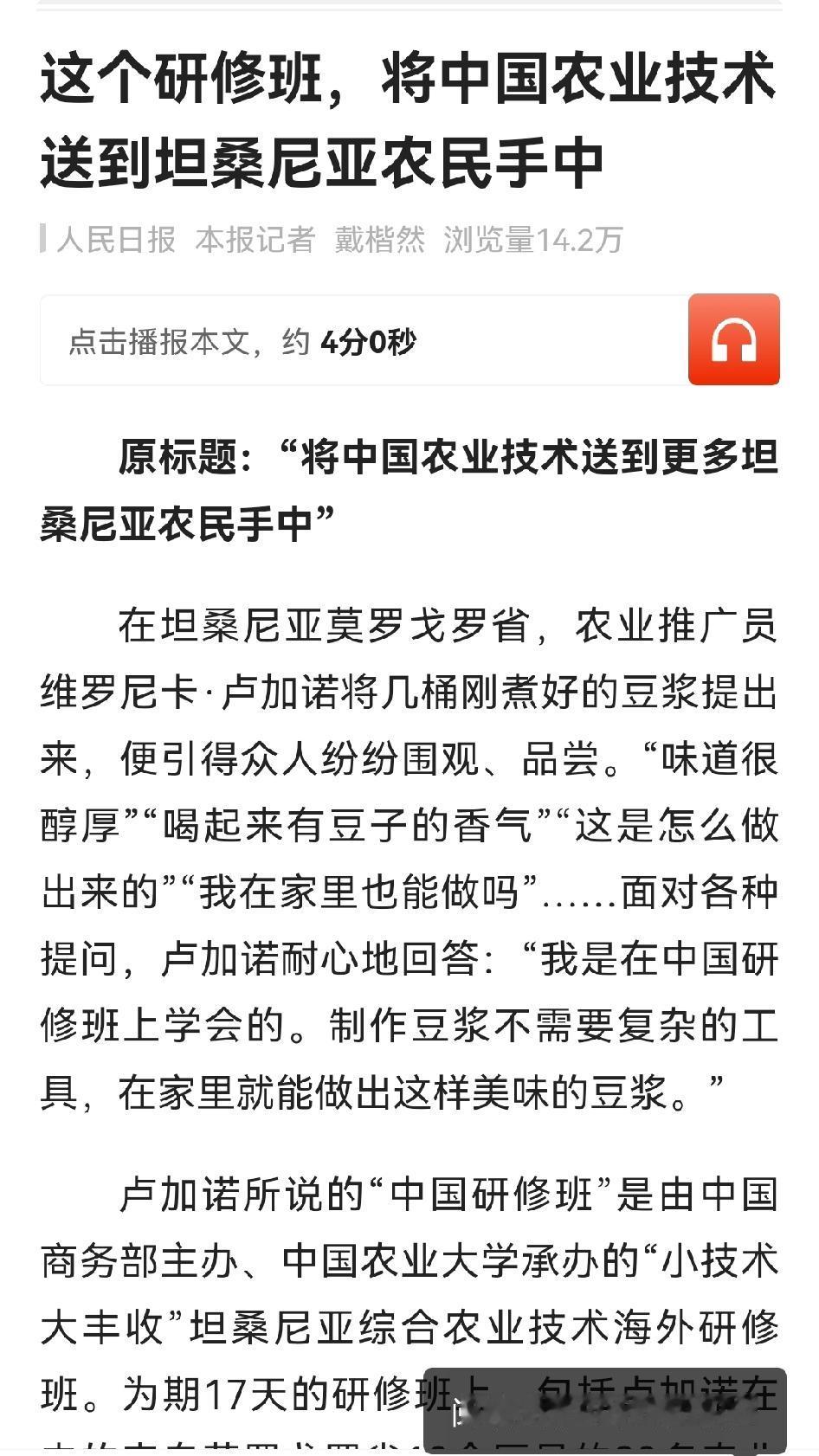 在坦桑尼亚,中国办了一个“小技术大丰收”农业研修班,从2011年开始,教当地农民玉米密植增产;2021年又升级教玉米大豆套种、豆制品加工,覆盖选种、种植、到销售全链条。坦桑尼亚莫罗戈罗省的行政秘书穆萨说:中国把农业技术送到更多农民手中。 为什么这么做?因为中国是真心想让非洲朋友吃饱饭。 西方那一套,给点小钱,换回大好处。而中国教他们用好脚下的土地,提高产量,还能把多余的粮食卖出去,实打实的技术,实打实的诚意。 老话说得好:授人以鱼不如授人以渔。 把非洲人民当朋友,而不是当棋子。这才是真正的帮助。 同样是帮助,有人给钱,有人给方法。而中国选了更难、却更真心的一条路。