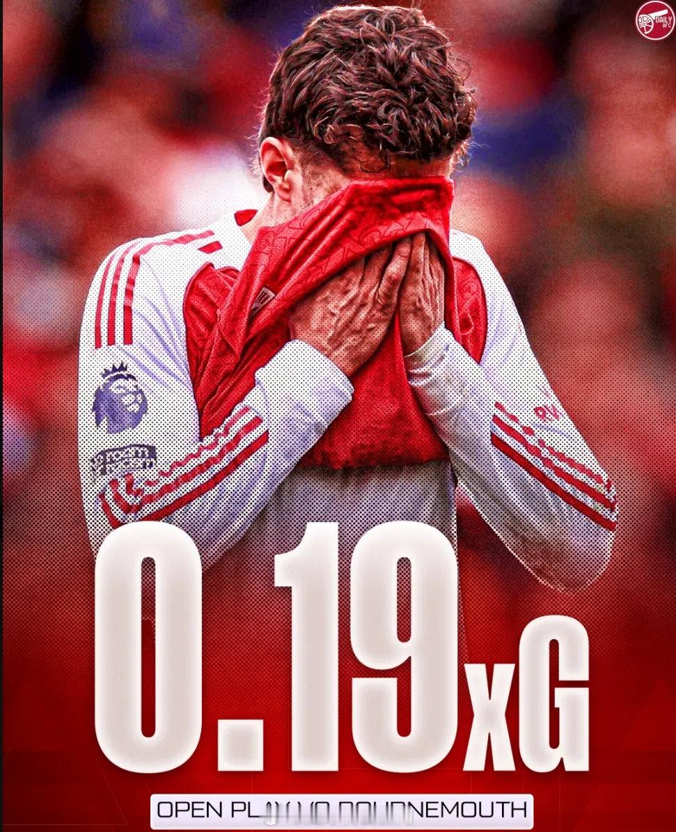 根据天空体育统计,阿森纳在不敌伯恩茅斯的比赛中运动战预期进球只有0.19,是枪
