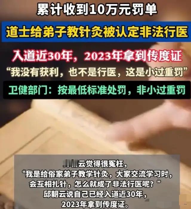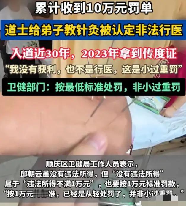 四川南充,一位61岁的老道爷,因为教徒弟针灸,被人举报非法行医,罚了5万。老头气不过,外出云游去了,结果罚款没交,又给加了5万,变成十万了!他这才急了眼,赶紧去申请复议,说罚得太重。 - 一份写着10万元的强制执行通知放在南充卫健部门的桌子上,61岁的邱朝云看到这个数字时手都有点抖,而更让他难以接受的是,这个数字一开始其实只有5万元,短短时间却翻了一倍。 这件事要从2025年春天说起,当时他在集凤观修行已经将近30年,平时教人读《周易》和《道德经》,也会把祖传的针灸手艺教给徒弟,但他一直强调没有医师资格证不能对外行医,只能在内部练习。 他自己心里也清楚规矩,所以一再提醒徒弟不要出去给人治病,邻居偶尔有点腰酸背痛来找他,他也只是顺手扎几针,甚至连感谢钱都不收,在他看来这只是人情帮忙,不算真正行医。 但问题很快就来了,2025年4月几个徒弟因为矛盾闹翻,提出要退拜师费,他也痛快退了钱,本以为事情就此结束,没想到对方转身就举报他无证教针灸。 执法人员随后介入,5月直接到集凤观检查,屋里没有任何收费账本,但发现了银针、艾条、酒精棉等工具,这在监管眼里已经构成了医疗行为的证据链。 8月处罚决定下达,认定其存在无证从事医疗活动的情况,按照最低标准处罚5万元,同时没收相关器具。 邱朝云对此非常不理解,他认为自己没有收钱,也没有对外行医,只是师徒之间互相练习,但法律认定的标准并不看有没有收费,而是是否发生了诊疗行为。 在他选择拒绝签收处罚并离开后,系统程序继续推进,逾期未缴罚款开始计算滞纳金,时间越久金额越高,规则并不会因为当事人离开而停止。 到了2026年2月,原本的5万元已经累计增长到10万元,同时还限制了他部分活动权限,他这才重新回来申请行政复议,希望重新解释处罚合理性。 他主要争议点是自己没有造成任何伤害也没有获利,但执法部门回应很明确,只要涉及针灸等医疗行为,没有资质就必须处罚,这是底线规则不能突破。 这件事在网络上也引发争议,有人觉得他只是民间传承,不应该按医疗机构标准处罚,也有人认为只要涉及人体治疗就必须严格管控,否则风险太大。 从法律逻辑来看,关键不在于有没有收费,而在于是否进行了可能影响健康的诊疗操作,针灸本身就属于医疗行为,因此必须持证才能开展。 随着讨论扩散,问题也变得更复杂,一方面是传统师徒制的技艺传承,另一方面是现代医疗监管体系,两套规则在现实中发生了直接碰撞。 目前这笔10万元罚款仍在行政复议程序中等待最终结果,而这起事件也让更多人开始思考传统技艺在现代制度下该如何存续和平衡。