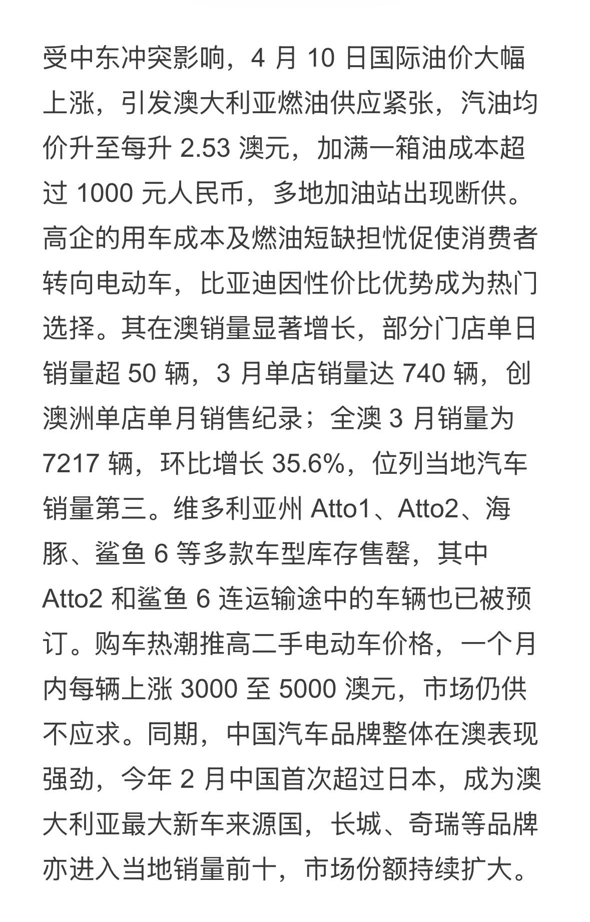 受油价上涨推动,比亚迪3月澳大利亚销量7217辆,中国品牌份额持续提升 油价上涨了,加油花费太多有点怕了,转身买电车了[捂脸][捂脸]