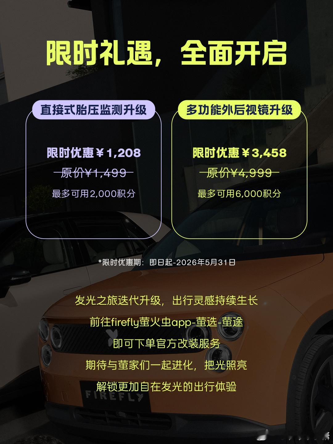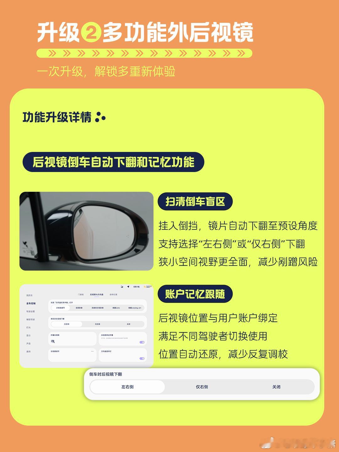 可以加装直接式胎压监测(限时 1208 元)、多功能外后视镜(限时3458 元),带倒车下翻、记忆功能还有智驾小蓝灯。