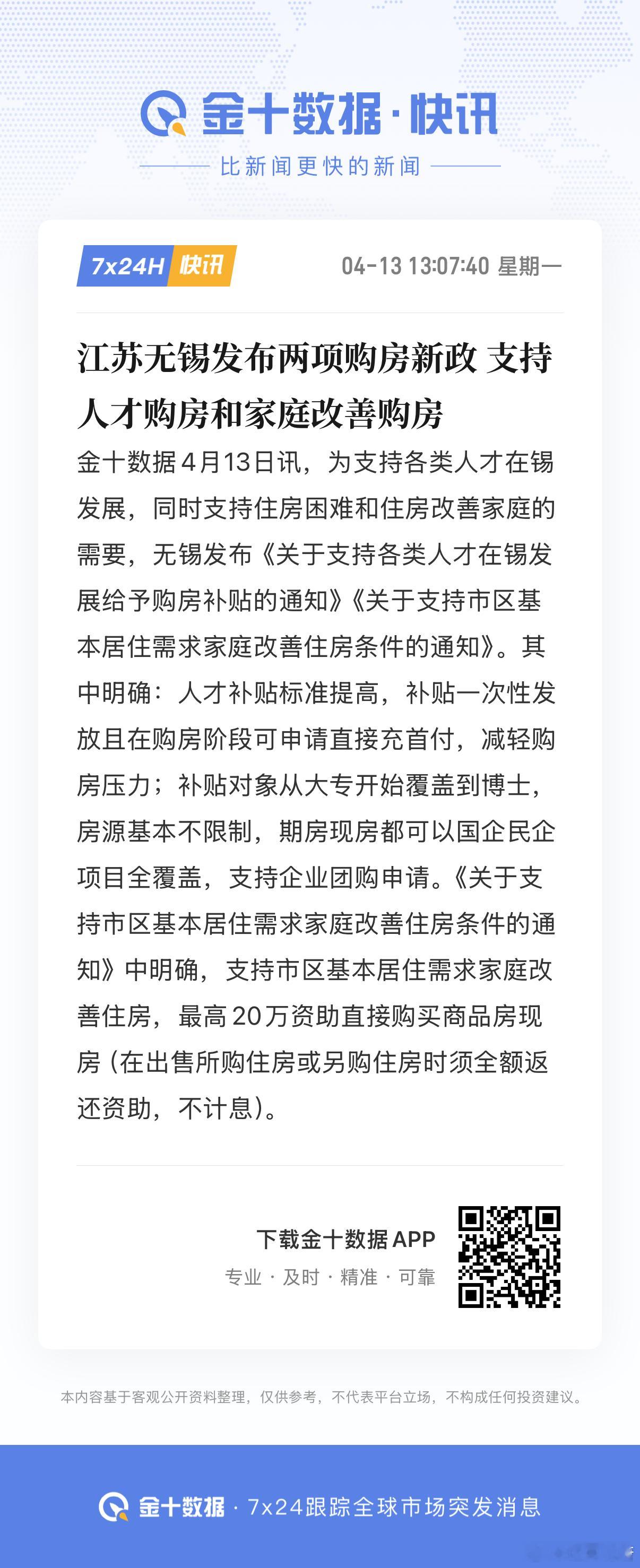 江苏无锡发布两项购房新政,支持人才购房和家庭改善购房,最高20万资助直接购买商品房现房(在出售所购住房或另购住房时须全额返还资助,不计息)