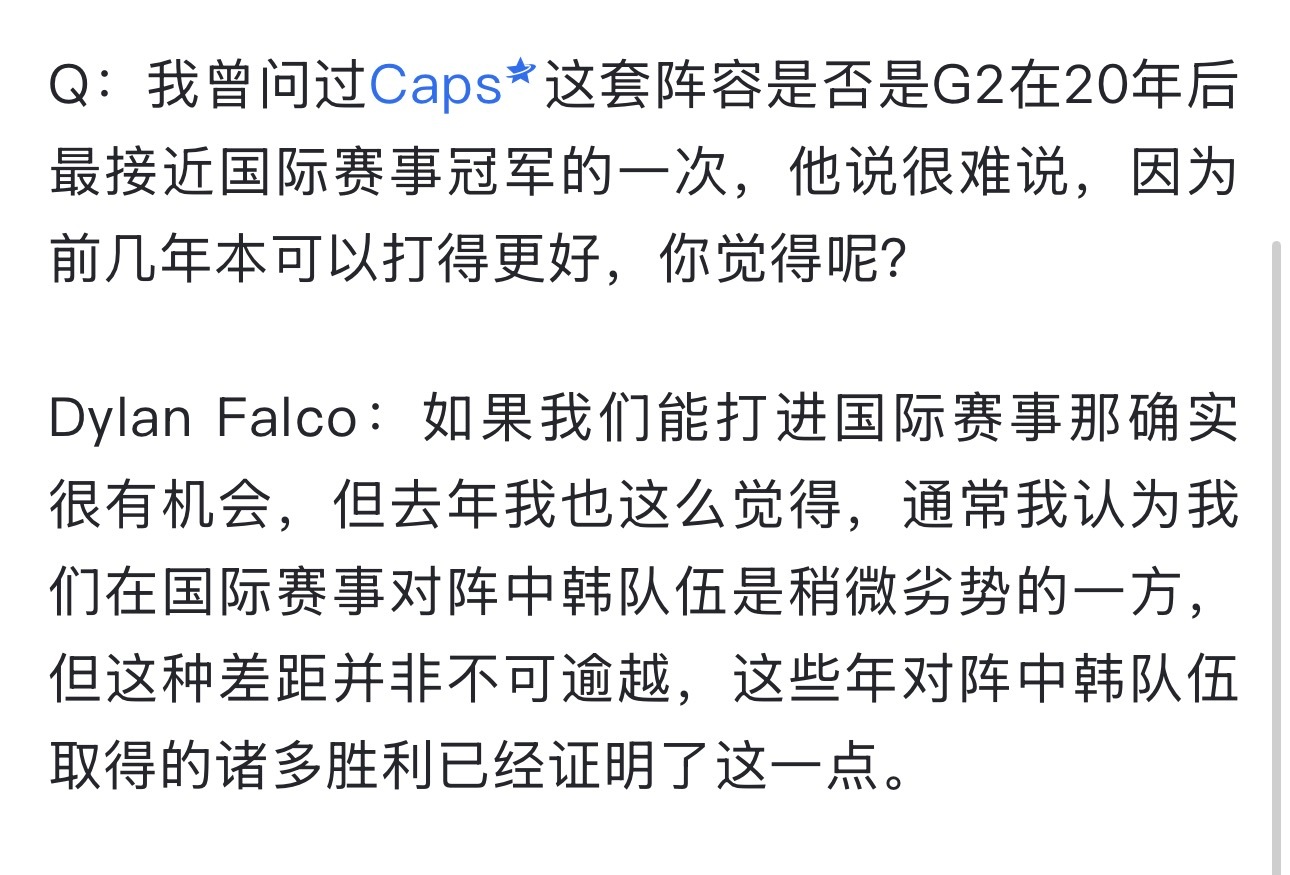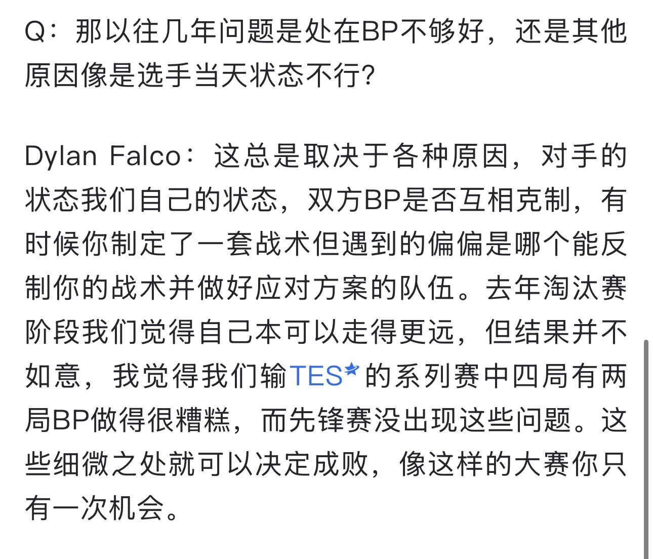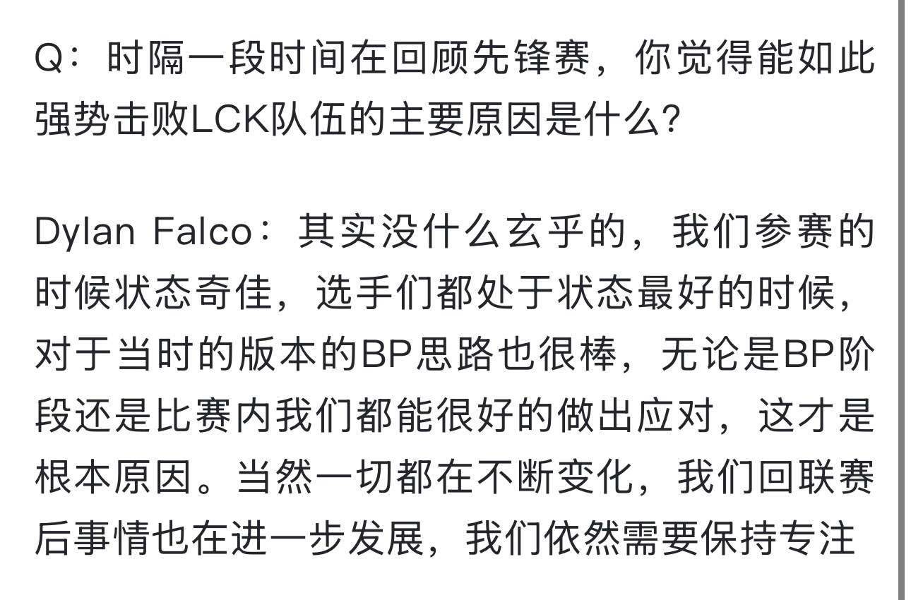 Dylan Falco接受采访说先锋赛能赢LCK就是状态好BP做得好。然后开始翻旧账了,说去年输TES那个BO5四局有两局BP很烂