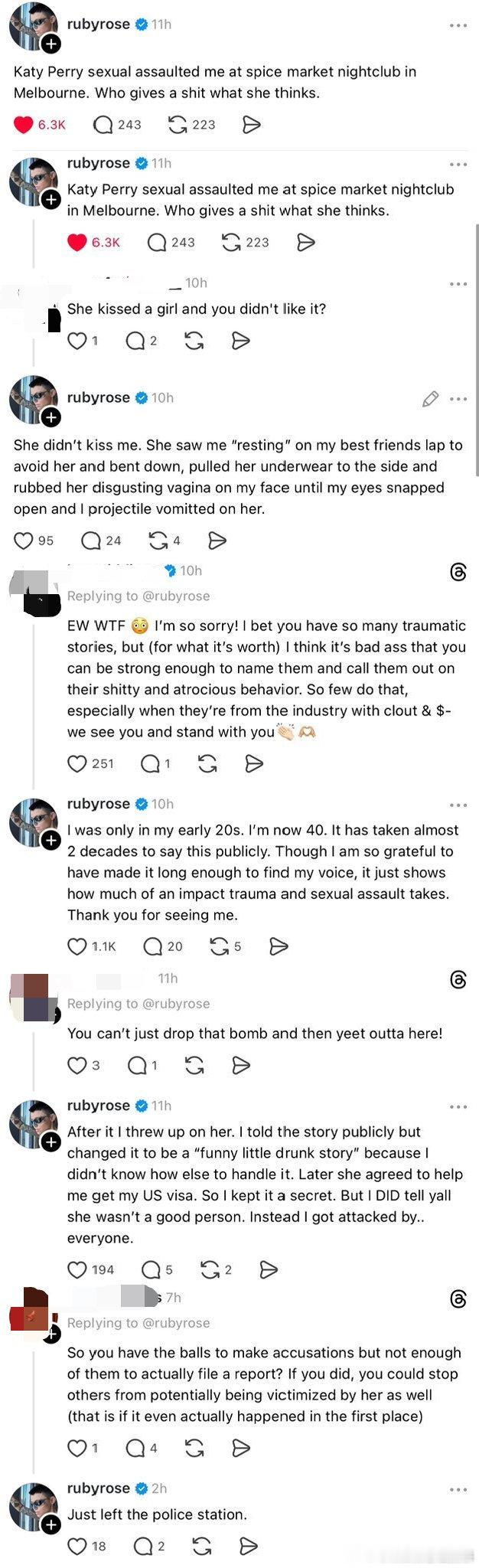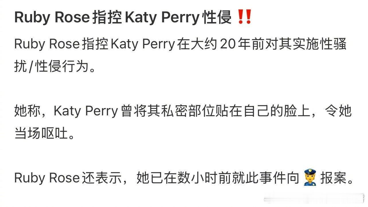 女演员鲁比·洛斯指控水果姐Katy Perry,说对方曾在她二十岁出头时对她实施性侵,称水果姐把私密部位贴在她脸上摩擦,令她当场呕吐