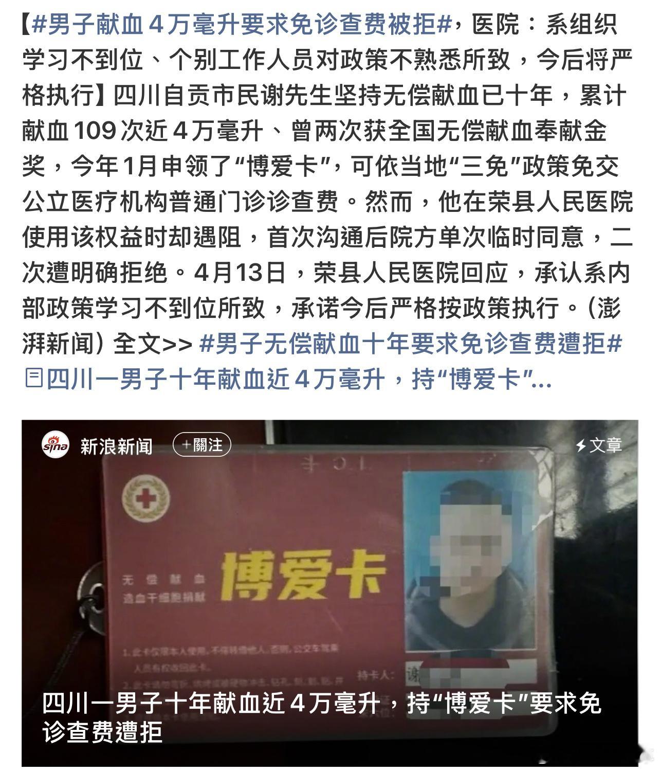 男子献血4万毫升要求免诊查费被拒无偿献血已十年,后面申领“博爱卡”,可依当地“三免”政策免交公立医疗机构普通门诊诊查费,结果去医院使用权益被拒了,医院这个回应就说业务不熟悉,真的别让好人寒了心啊。