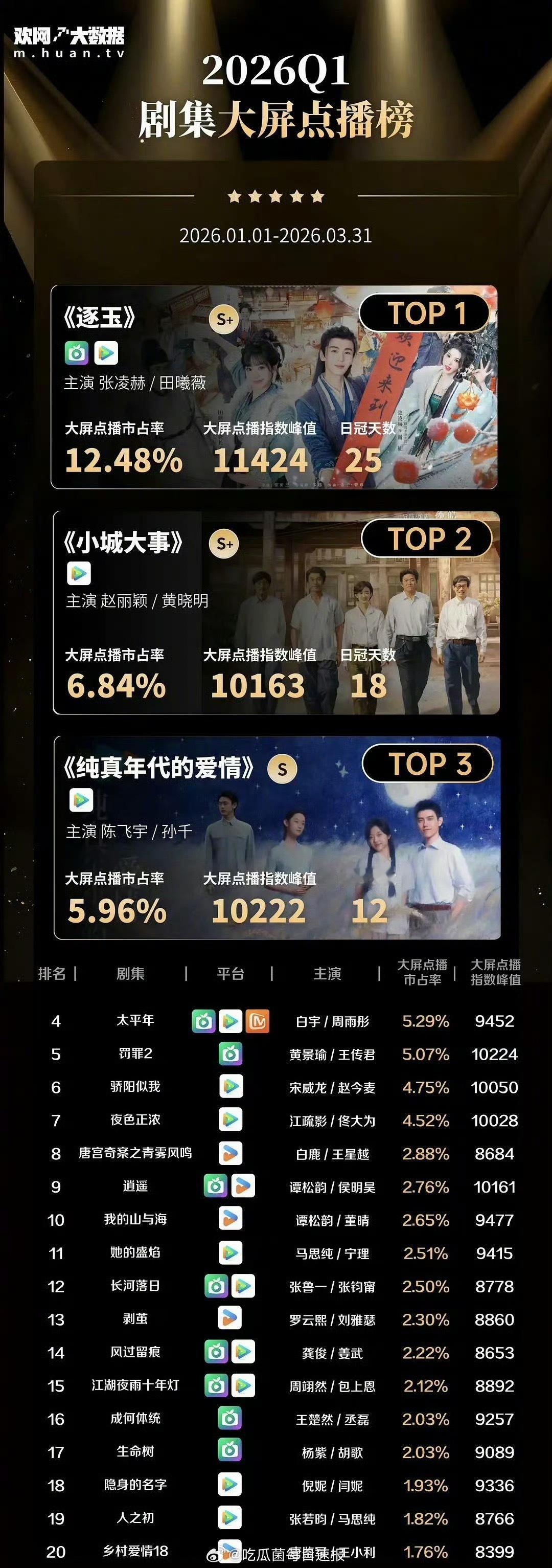 欢网大数据2026年第一季度剧集大屏点播榜榜单,前三分别是张凌赫、田曦薇《逐玉》;赵丽颖、黄晓明《小城大事》;陈飞宇、孙千《纯真年代的爱情》 ,大家都看过吗
