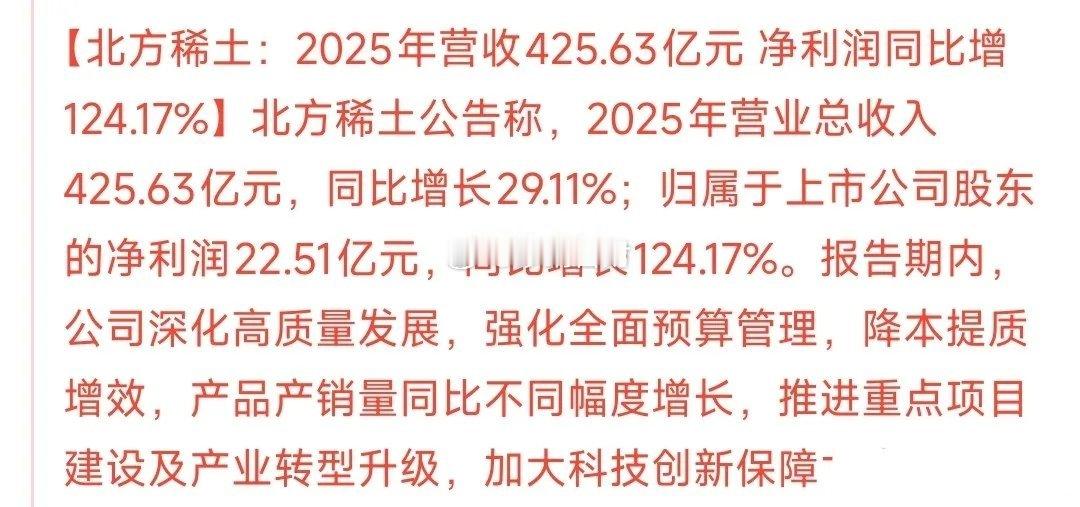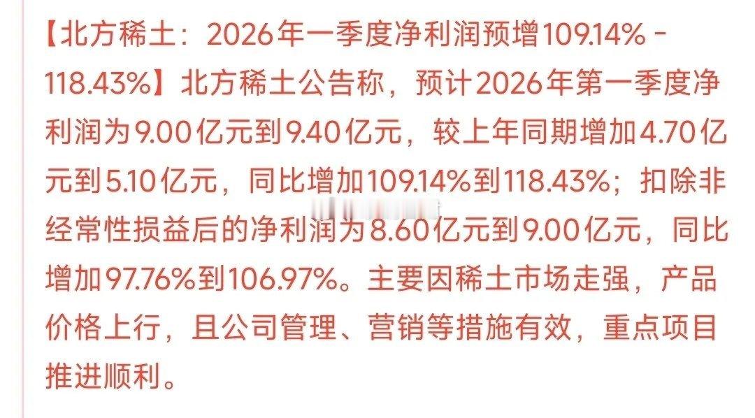 稀土龙头发布业绩报,稀土板块明天还是比较稳的北方稀土发布2025年业绩报,净利润22.51亿,增加124.17%。机构此前预期2025年业绩21.76 亿~23.56 亿元之间,同比 +116.7%~134.6%。业绩完全符合预期。2026年一季度报净利润9-9.4亿,同比 +109.1%~118.4%。此前市场预期约 8.5~9.5 亿元,完全超出了预期。