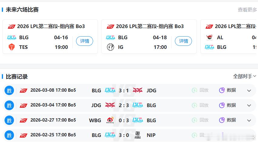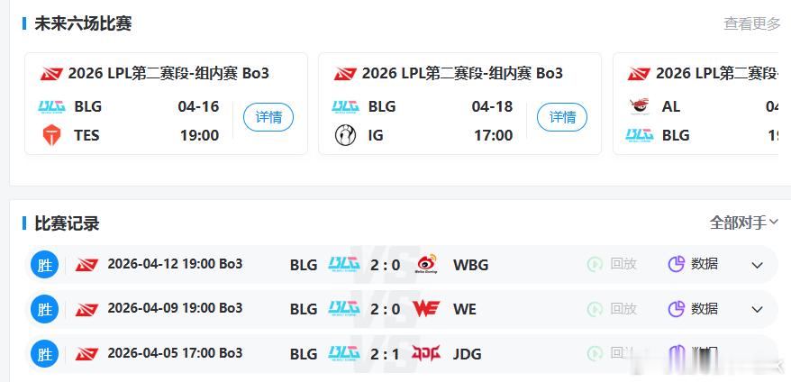 BLG十二连胜包括LPL第一赛段四连胜、全球先锋赛四连胜、EWC一胜、第二赛段三连胜、今晚被JDG终结了接下来BLG的三个对手分别是TES、IG、AL~
