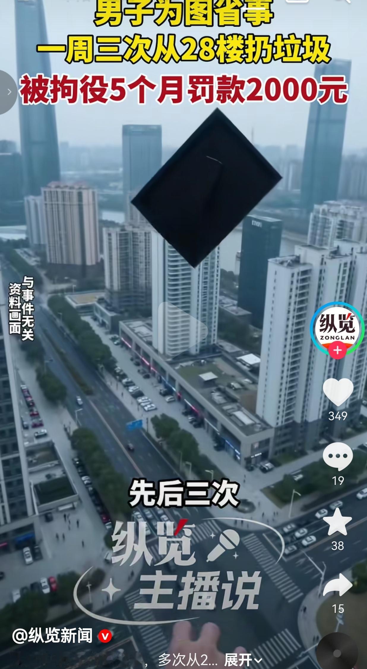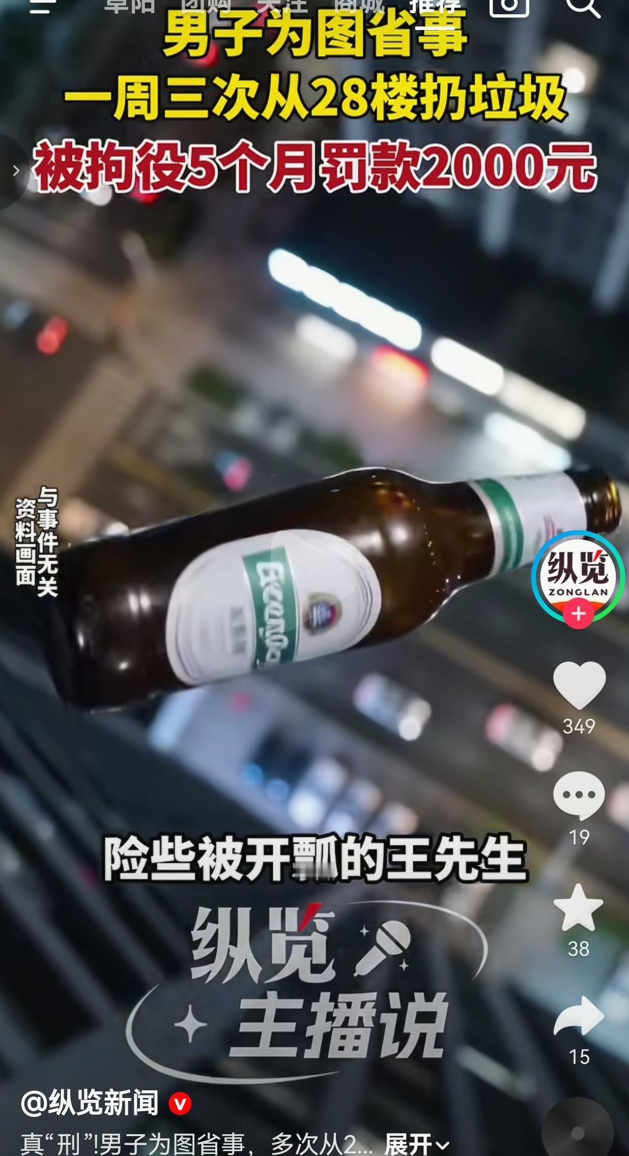 惊出一身冷汗!一男子为了省几步路扔垃圾,一周三次从28楼高空抛物,啤酒瓶差点砸伤路人,最后把自己送进看守所,这纯纯是自作自受,活该! 2025年10月,扬州的王先生晚上正常走在小区路上,突然“哐当”一声巨响,一只啤酒瓶直接砸在他脚边,碎玻璃溅了一身! 王先生当场吓懵,差几厘米就砸在头上,那可是28楼扔下来的瓶子,一旦砸中后果不堪设想! 他吓得赶紧报警,警方通过现场勘查、调取监控,很快锁定了住在28楼的嫌疑人周某!到案后,周某对高空抛物的行为供认不讳! 原来他就是图省事,短短一个星期内,先后三次从高层电梯间窗户往外扔垃圾!啤酒瓶、生活垃圾随手就扔,完全不顾楼下行人安全。 一周三次,明显是屡教不改,根本没把别人的安全放在心上!近日,当地法院以高空抛物罪,判处其拘役五个月,并处罚金2000元!想偷懒省几步路,结果换来牢狱教训,真是得不偿失! 网友看到后评论说:真刑!就为了省几步路差点伤人,判五个月一点不冤,就该让这种人长长记性! 也有的网友说:最恨高空抛物!不想下楼可以不扔,但不能拿别人的安全开玩笑! 还有的网友说:一周三次,明显是惯犯!幸好没造成严重后果,依法处理太及时了! 更有网友表示:住在这种人楼下真的心慌,必须严肃处理,才能让大家安心! 我越看越生气!你自己懒、不想下楼扔垃圾,是你自己的问题,但凭什么从28楼往下扔东西?凭什么让无辜路人替你的懒惰担风险? 28楼是什么概念?一个鸡蛋掉下来都可能伤人,更别说啤酒瓶这种硬物!这不是简单扔垃圾,这是漠视安全、漠视生命,是实实在在的犯罪! 一周三次,不是一时糊涂,是明知故犯!他扔的时候,就没想过楼下可能有老人、孩子、孕妇吗?没想过砸到人会造成多大伤害吗?没想过要承担法律后果吗? 现在好了,拘役五个月、罚款两千,还留下违法记录,今后找工作、生活都会受影响。就为了省几分钟,把自己人生搭上,真的太不值了! 我始终觉得,懒惰可以改,但漠视安全不能忍。有手有脚,多走几步路真的不难,别拿别人的安全,为自己的懒惰买单! 这件事虽然只是个案,却反映出很多人安全意识淡薄。我们走在路上、在小区散步,谁也不想突然遭遇“天降横祸”。 高空抛物从来不是小事,而是明确的刑事犯罪!今天扔瓶子,明天扔杂物,每一次随意抛物,都可能酿成无法挽回的悲剧。 必须对这种行为零容忍,让每一个漠视安全的人付出代价,让大家真正明白:高空抛物不是小事,是违法,是害人,更是害己! 别让孩子不敢在楼下玩耍,别让老人不敢出门散步,别让每一个普通人,都要为别人的错误提心吊胆。 最后,我想说的是:高空抛物不是懒,是恶;不是小事,是违法!莫因一时方便,毁了自己一生! 对此,你怎么看?