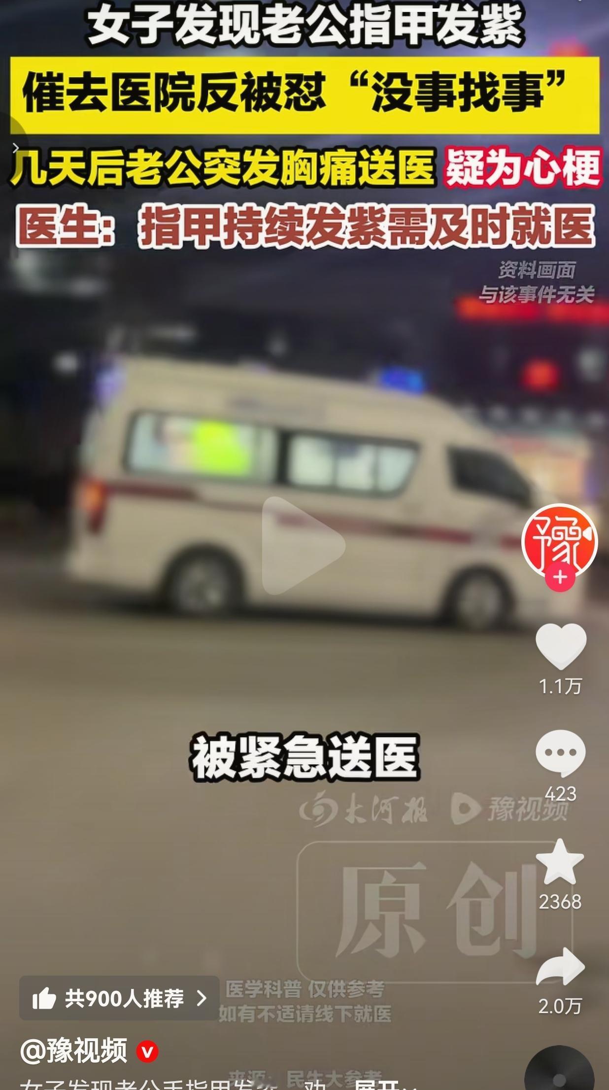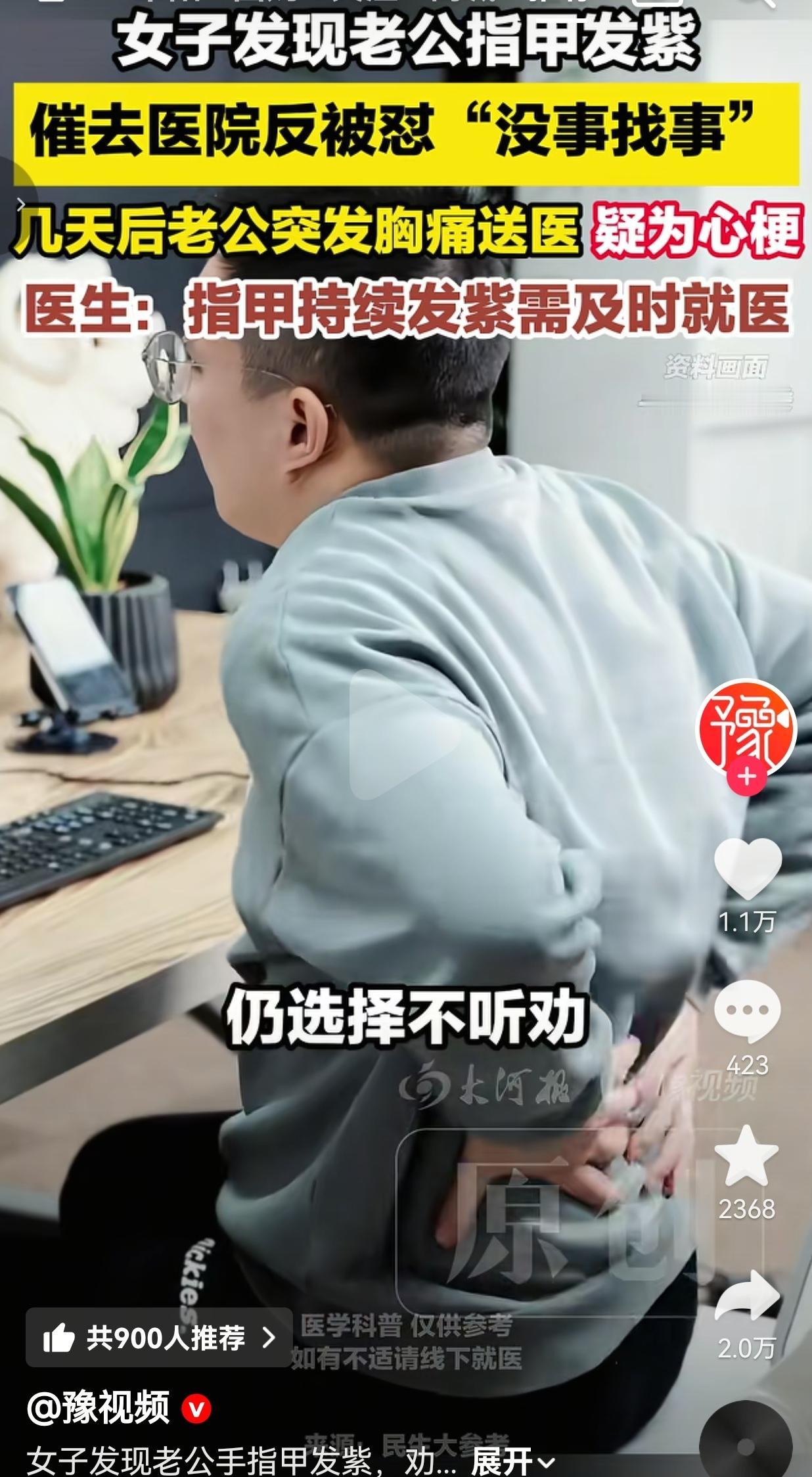 这哪是没事找事,这是拿命在赌啊!老婆一眼发现老公指甲发紫,催着去医院检查,结果被老公劈头盖脸一顿骂,说她吃饱了没事干!结果才过几天,老公直接突发胸痛送医,疑似心梗!医生一句话,直接给全网敲响了警钟! 一位细心的妻子,偶然间发现老公的手指甲发紫发暗,颜色不对劲,用温水泡了半天也没缓解。 她心里咯噔一下,赶紧催老公去医院做个检查,别是身体出了大问题。 可谁知道,老公非但不领情,反而当场炸了!对着老婆一顿怼:“我好端端的,能有什么事?你就是没事找事,吃饱了撑的!” 不管老婆怎么劝,他就是油盐不进,死都不肯去医院,还觉得老婆小题大做,纯属瞎操心。 就这么拖了几天,老公突然开始后背疼,紧接着直接突发剧烈胸痛,整个人疼得直不起腰! 老婆吓得魂都飞了,赶紧打120把人送进医院!急救人员初步判断,疑似心梗! 送到医院后,医生一检查,当场就说了:指甲持续发紫发暗,绝对不是小事,这是身体发出的救命预警!必须第一时间就医,千万不能拖!要是早来几天,也不至于遭这么大罪! 网友看到后评论说:我老公也这样!我让他体检他骂我没事找事,看完这个我直接把手机甩他脸上了! 也有的网友说:听老婆话能救命!多少男人就是死在“我没事”“别瞎操心”上! 还有的网友说:指甲发紫就是缺氧信号!心梗、肺栓塞都可能!真不是吓唬人! 更有网友表示:男人啊,对自己的身体盲目自信,对老婆的话充耳不闻,出事了才知道后悔! 说实话,多少男人就是这个德行!老婆关心你身体,催你去检查,你嫌烦、嫌啰嗦,骂人家没事找事!等真出事了,躺在病床上的是谁?急得掉眼泪的又是谁? 指甲发紫是什么?是身体在给你发最后通牒!是心脏、血管在喊救命!这不是小毛病,是能要人命的信号!你自己不当回事,老婆替你着急,你还反过来怼人家? 你以为你是身强体壮?你以为你是铁打的?多少心梗猝死的人,出事前都觉得自己“没事”!多少人就是因为这一句“没事找事”,错过了最佳抢救时间,最后阴阳两隔! 老婆是那个最希望你好好活着的人!她不是没事干,是怕你出事!她不是瞎操心,是在给你保命!你不领情就算了,还恶语相向,这不是蠢是什么? 这件事给所有男人、所有家庭都敲了一个响到震耳的警钟!身体从来不会骗人,那些不起眼的小信号,都是救命的提醒! 别再盲目自信,别再讳疾忌医,别再把老婆的关心当成驴肝肺!听人劝,吃饱饭,尤其是听那个真心为你好的人的话! 多少人就是因为一句“我没事”,错过了一辈子;多少家庭就是因为一次拖延,从此阴阳两隔!健康没有侥幸,生命没有重来! 最后我想说的是:老婆的唠叨不是啰嗦,是救命的警钟;身体的信号不是小事,是生死的门槛!别等躺进ICU,才懂那句“没事找事”有多珍贵! 来源:豫视频
