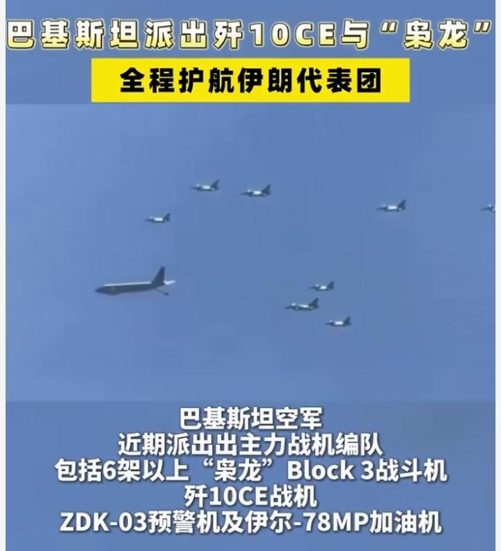 巴铁为伊朗谈判代表团护航,精锐齐出,阵容强大!一个全程护航,一个通风报信,巴铁就是比阿三靠谱!此次护航以歼10CE与"枭龙"为主力,辅以ZDK -03预警机及伊尔﹣78MP加油机!不禁让人好奇,巴铁这么做的动机究竟是什么呢?