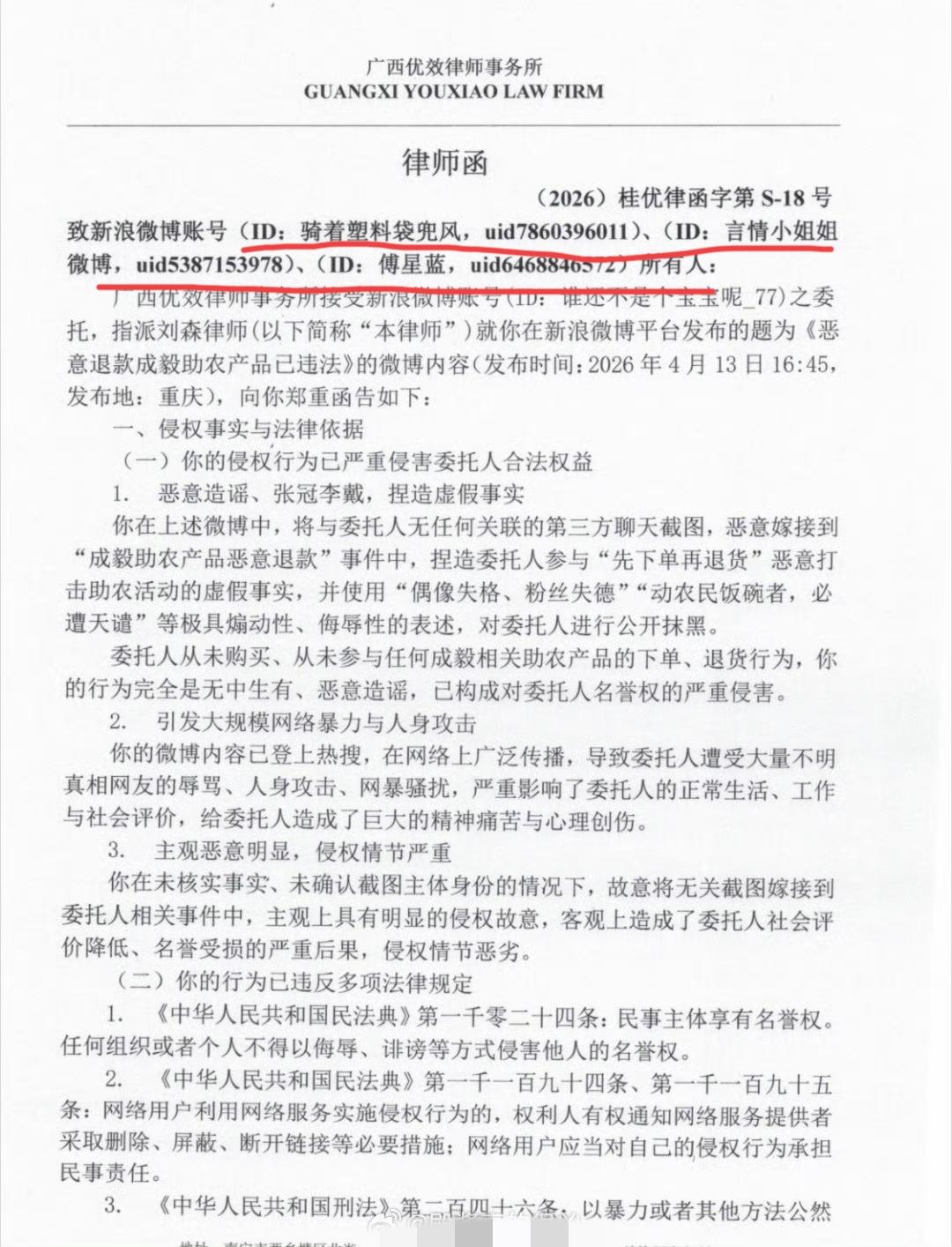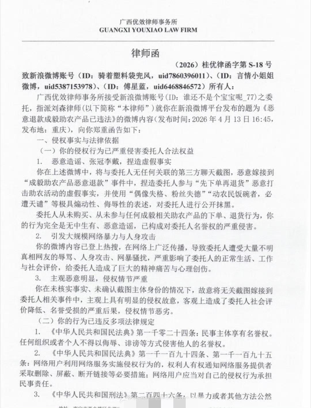 当成毅的粉丝,除了被明星告的概率高,还面临着被素人告的风险![石化] 起因是图二这三个账号造谣图一这位素人故意购买成毅助农产品后恶意退款。但这位素人声明,并未有过购买记录。并向这三位成毅粉丝发布律师函。 成毅助农产品,一般只有粉丝会买,粉丝嫌弃溢价,退货也是情理之中。不能因为产品问题,就李代桃僵,把粉丝退货行为移花接木给无辜的素人吧?这下好了,被素人告了,事情大条了![笑哭] 话说回来,粉丝说这家助农产品是成毅亲戚家开的,是真的吗?那何必这么麻烦,成毅你直接给个账号,粉丝也会乖乖送钱的![捂脸]