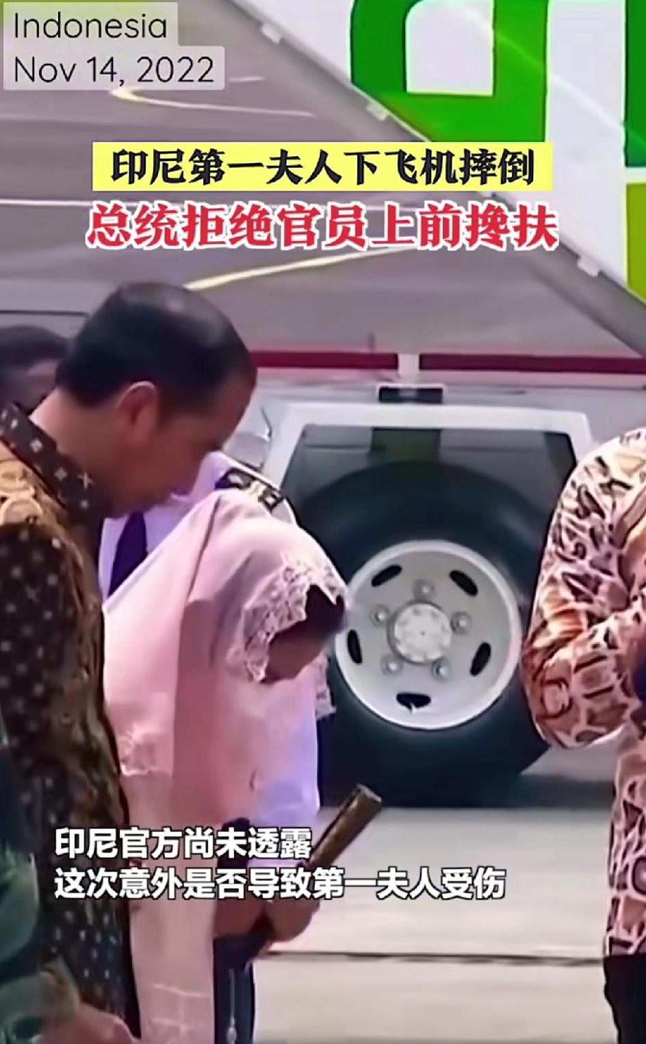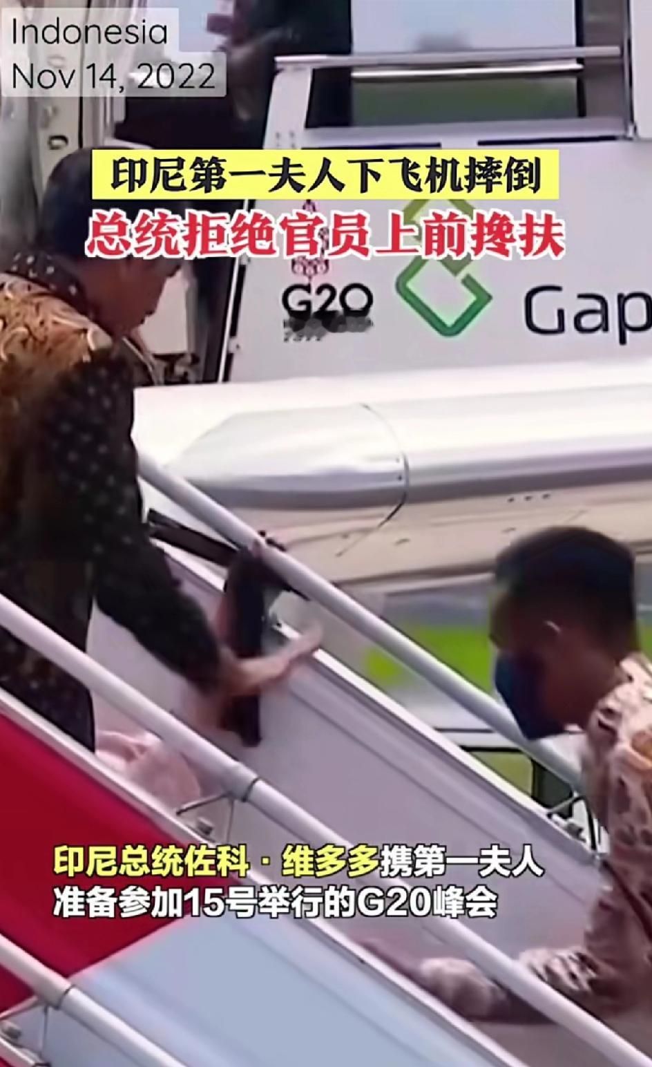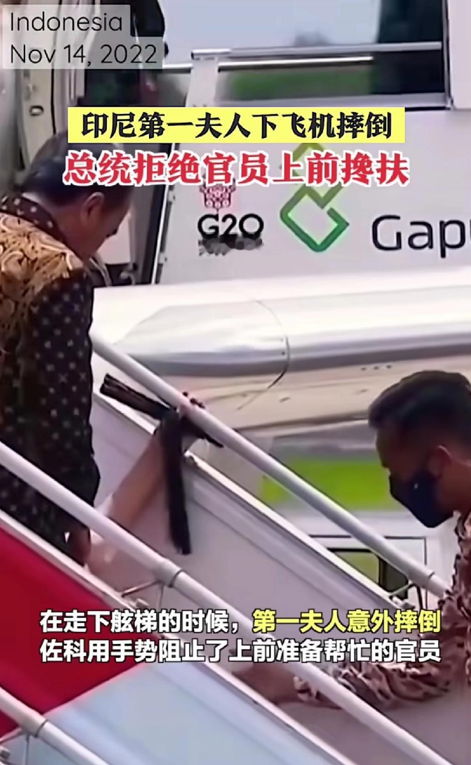 印尼总统佐科· 维多多携第一夫人参加15号举行的G20峰会。下飞机的过程中,夫人意外摔倒,有其他官员准备上前帮忙,总统给了一个拒绝的手势,穆斯林的女人是最干净的,不让其他男人碰。总统夫人还戴着白色的头巾,把脸蒙的紧紧的,只露两只眼睛。