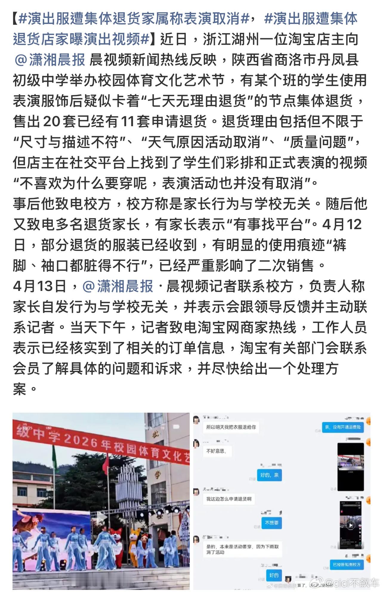 演出服遭集体退货家属称表演取消表演完之后家长以表演取消、尺寸不符为由集体退演出服,商家却刷到学生穿着同款彩排演出完整视频,结果退回衣物满是污渍……现在这种事情不少,买了之后集体退货的,逮着商家薅,7 天无理由不是这样用的啊,去租不好吗