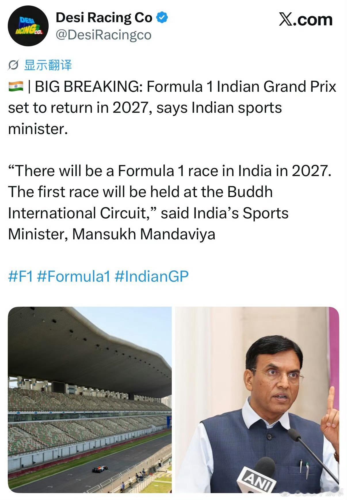 F1明年重返印度一厢情愿?印度体育部长表示,F1印度大奖赛将在2027重返赛历,将在首都新德里附近的布德国际赛道举办。