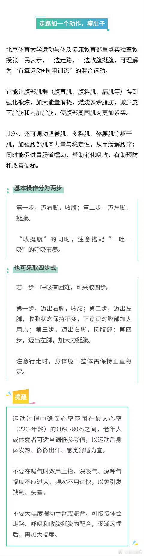 【走路加一个动作能瘦肚子】走路加个动作有助缓解便秘一边走路,一边收腹挺腹,可理解为“有氧运动+抗阻训练”的混合运动。它能让腹部肌群(腹直肌、腹斜肌、膈肌等)得到强化锻炼,加大能量消耗,燃烧多余脂肪,减少皮下脂肪和内脏脂肪,使腹部周围肌肉更加紧实。