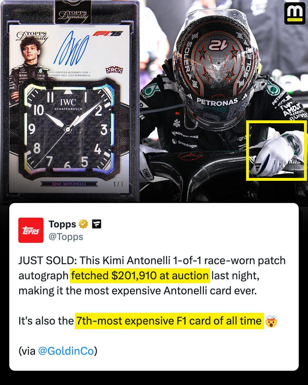 一张安东内利赛用服饰切片的签名车手卡(仅有1张)卖出了20.191万美元天价!!!这在所有F1收藏卡中排名第七位。