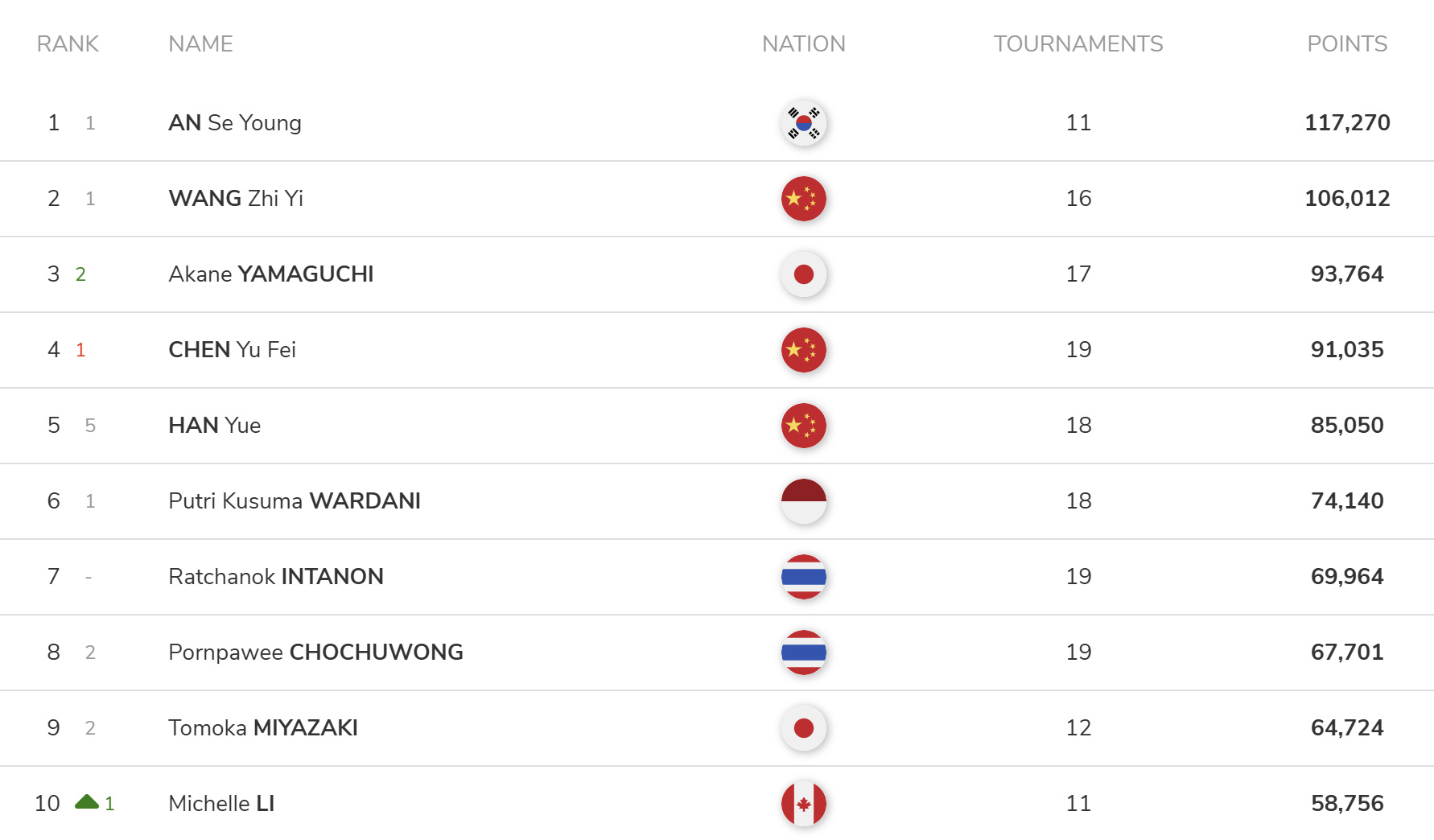 世界羽联2026年第16周世界排名公布,国羽各项世界前十如下: