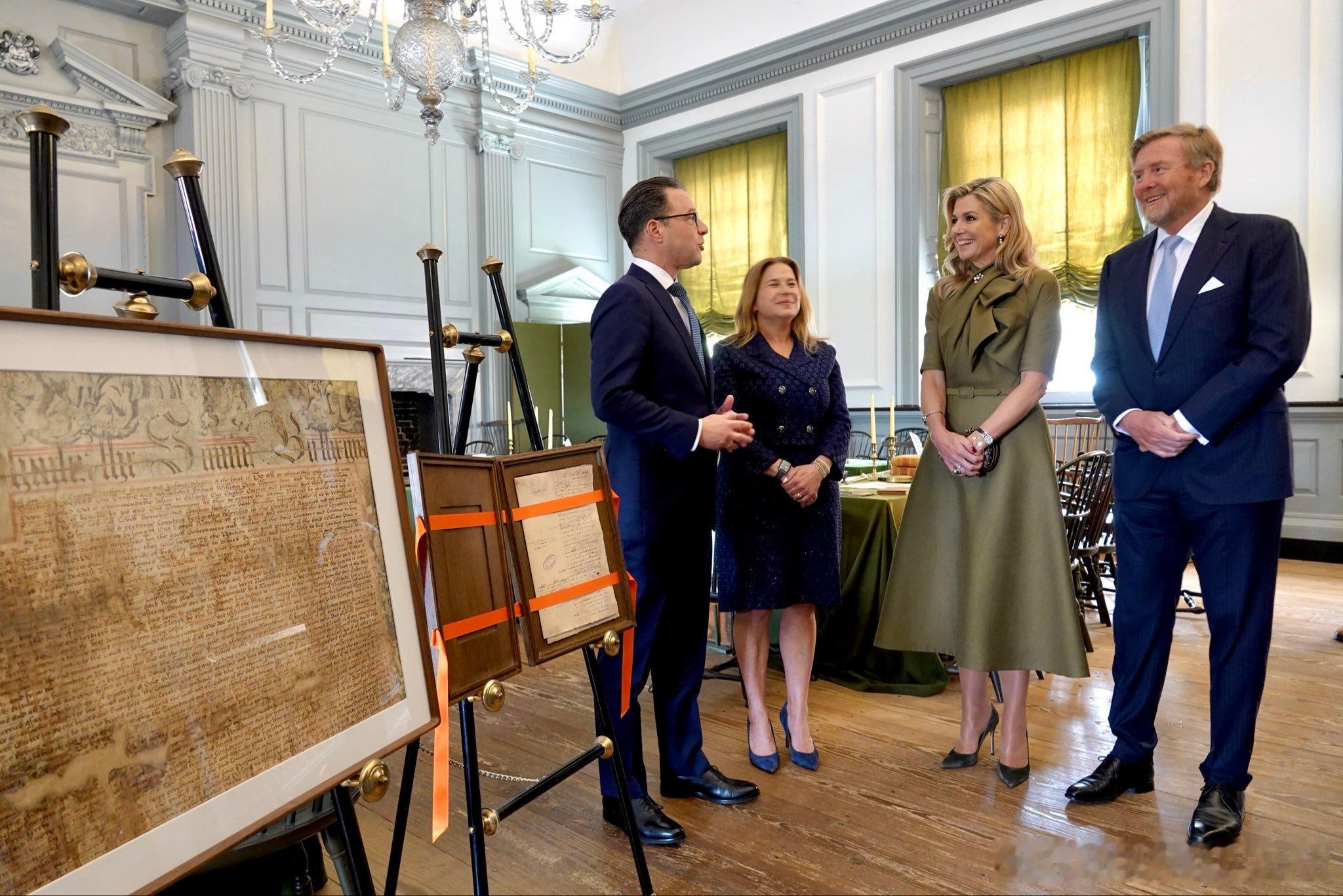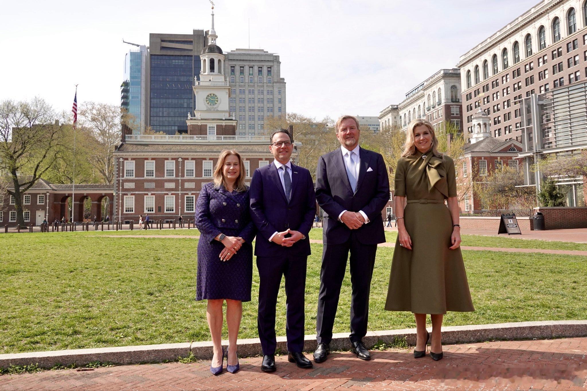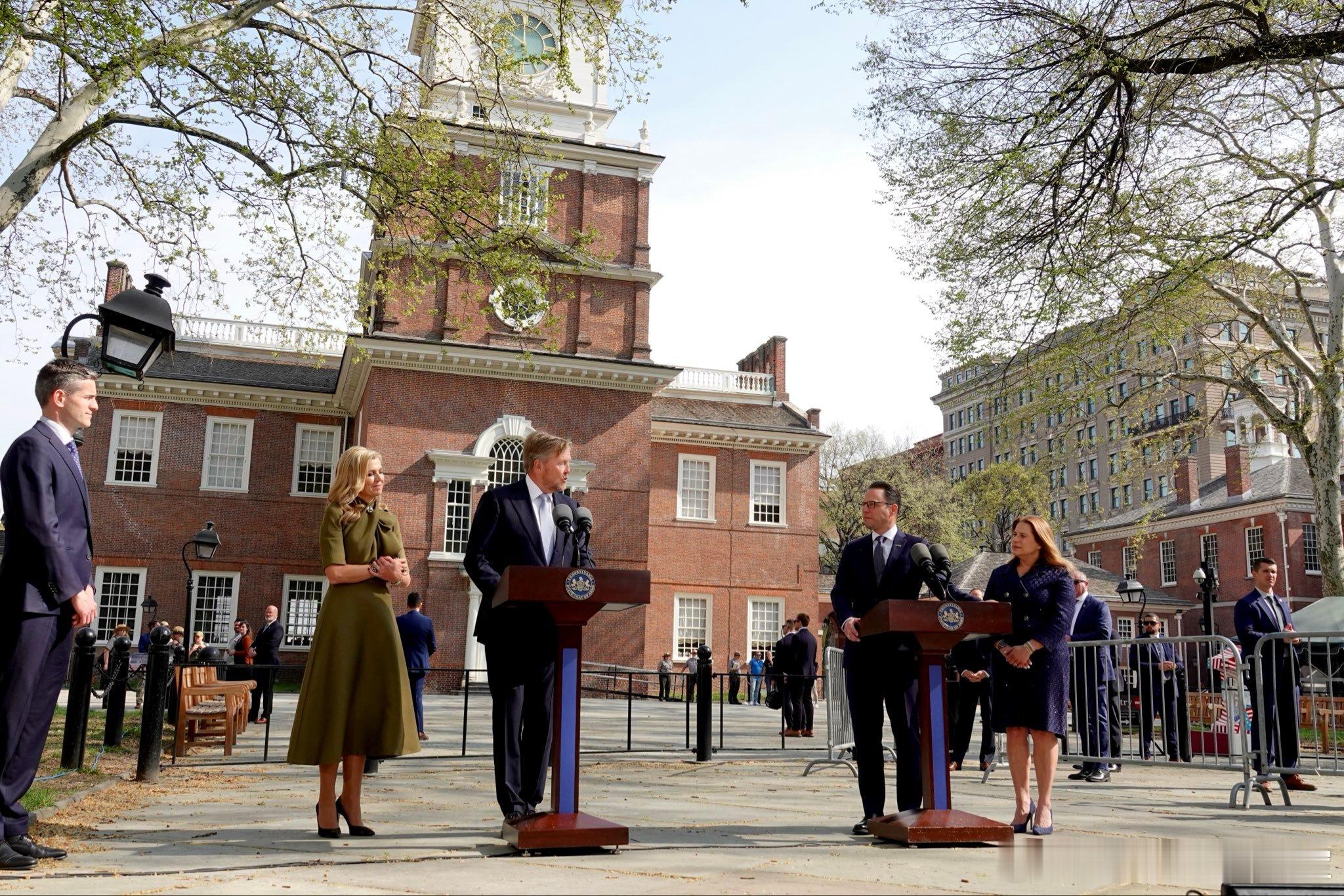 新闻 2026.4.13 荷兰国王夫妇工作访问美国Day 1,会开启为期三天的经贸行程,先是访问费城与宾州州长乔什·夏皮罗会面,接着参观费城独立厅,融合荷兰与美国艺术建筑风格的费什蒙社区,当晚出席在美国总统夫妇在白宫举行的晚宴,玛克西玛的裤装和裙装分别来自Jan Taminiau和Claes Iversen。