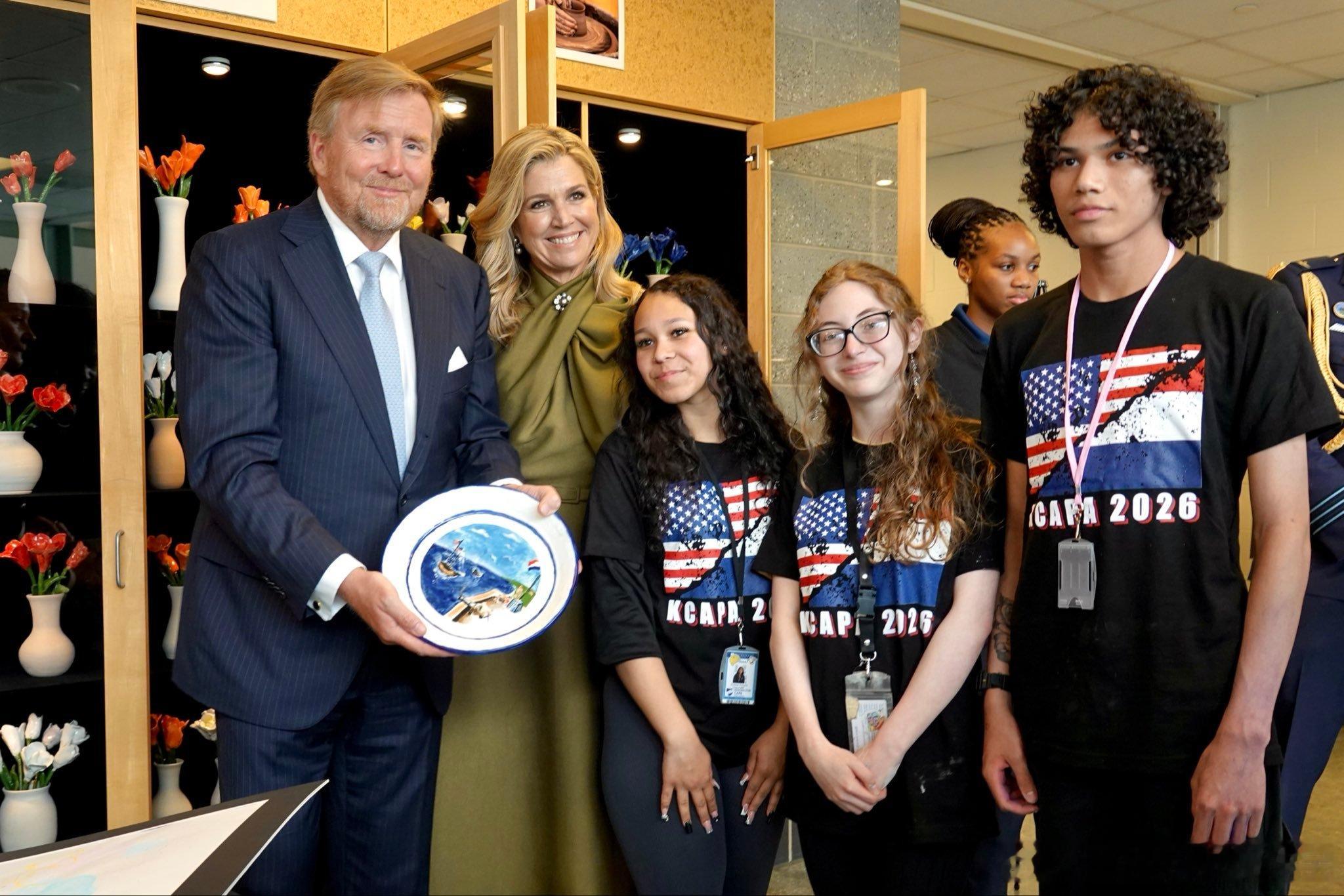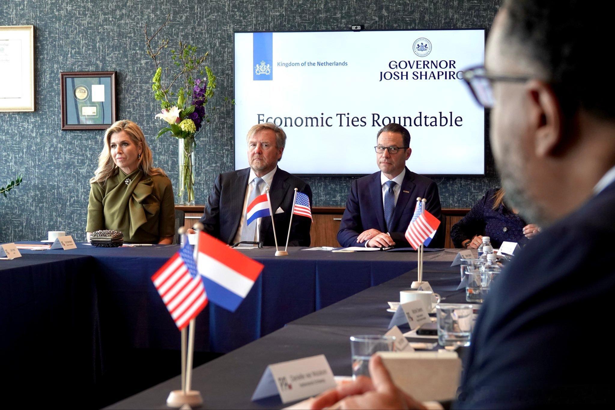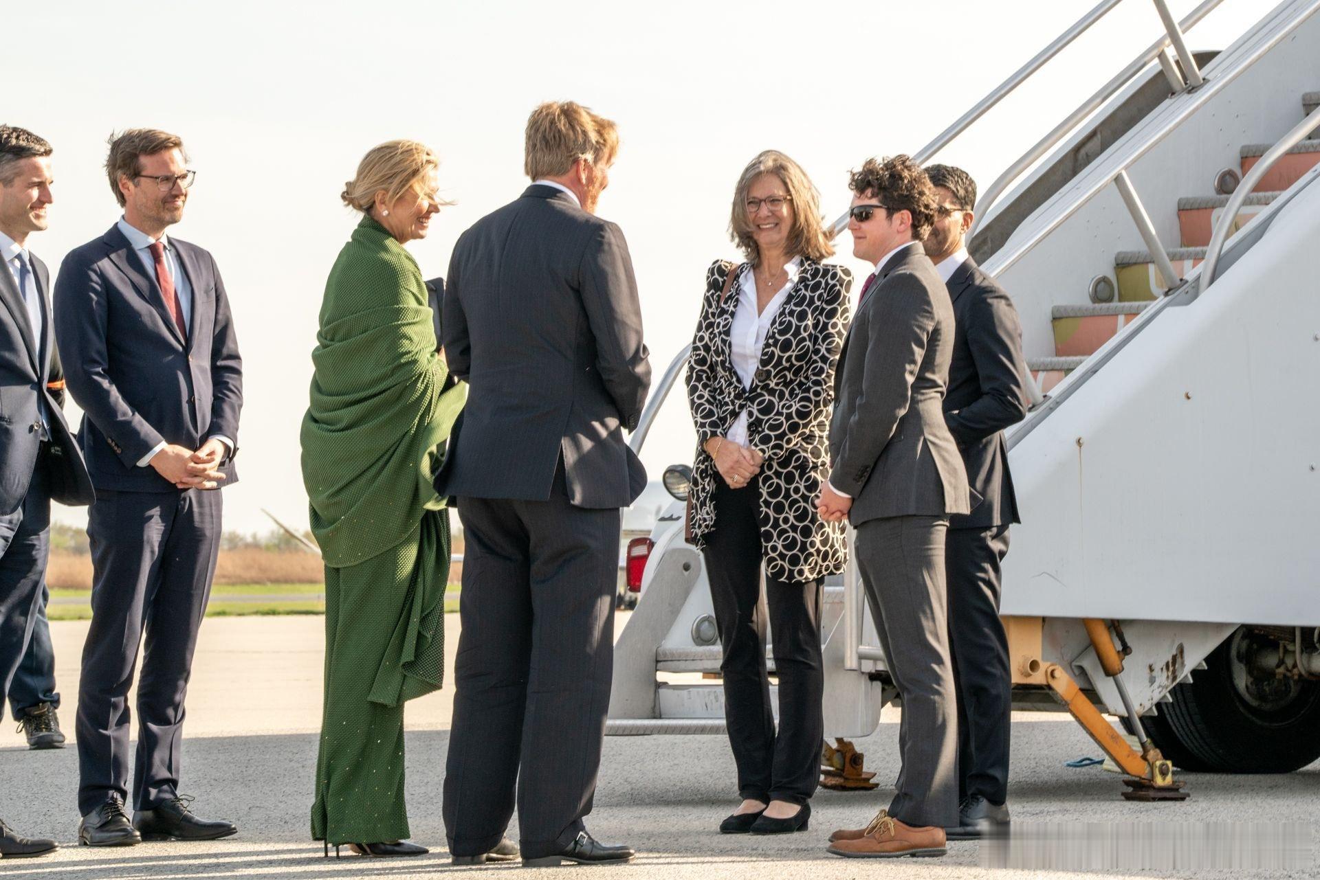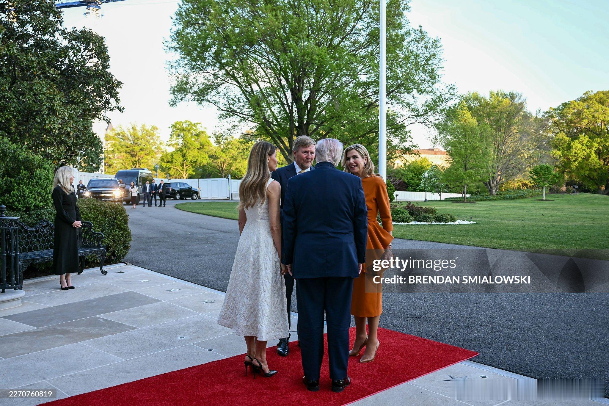 新闻 2026.4.13 荷兰国王夫妇工作访问美国Day 1,会开启为期三天的经贸行程,先是访问费城与宾州州长乔什·夏皮罗会面,接着参观费城独立厅,融合荷兰与美国艺术建筑风格的费什蒙社区,当晚出席在美国总统夫妇在白宫举行的晚宴,玛克西玛的裤装和裙装分别来自Jan Taminiau和Claes Iversen。