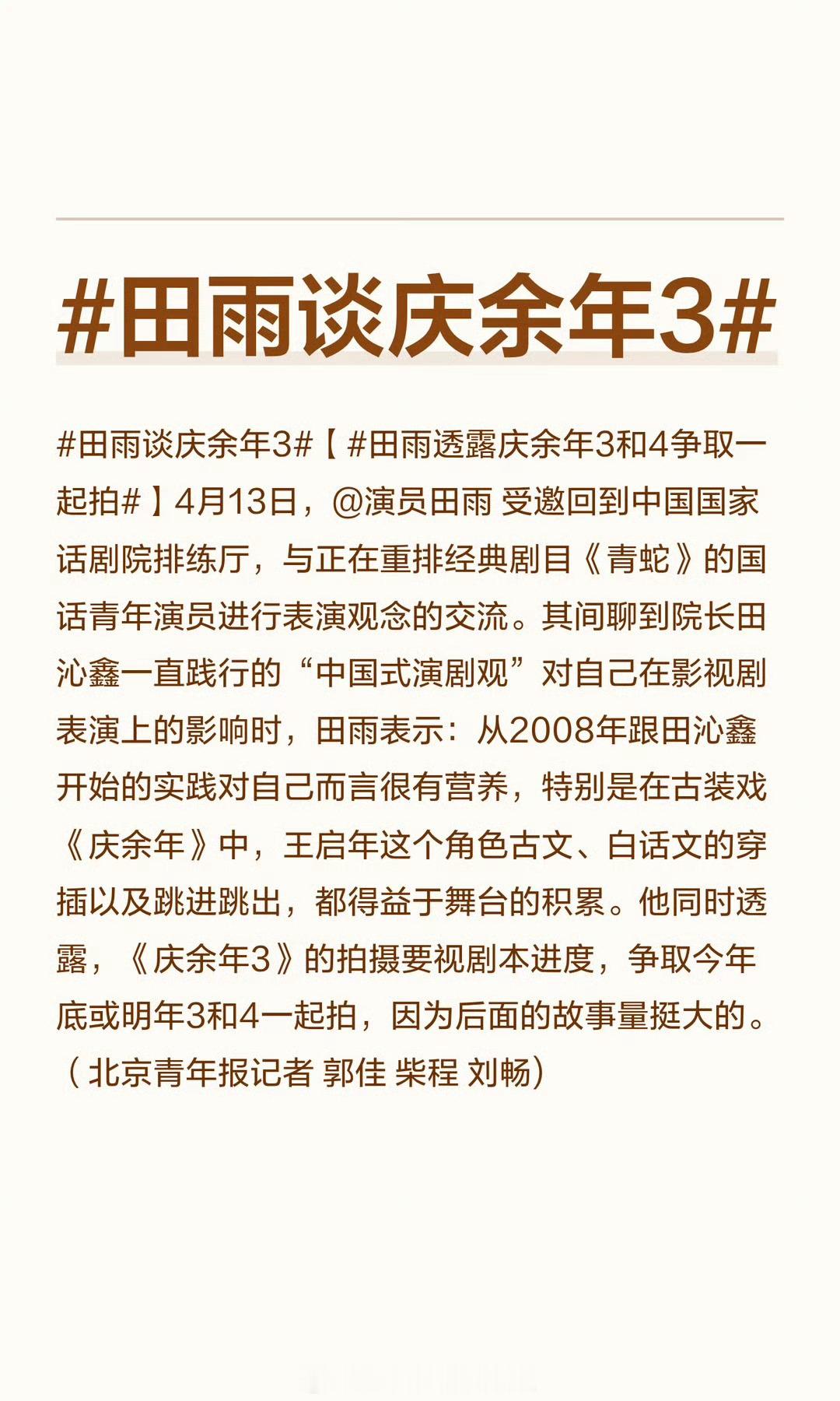 田雨谈庆余年3好了可以开播了