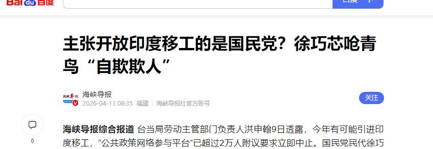 台国民党发布严正声明, 印度劳工的联署人数正式冲破三万大关,就在4月13日,台国民党发文称:坚决反对引进印度移工,绝不妥协! 民众积压已久的情绪,已经到了随时可能喷发的临界点。 其实,这种焦虑背后是岛内难以直视的人口结构危机。根据数据测算,台湾将在2026年初正式跨过“超高龄社会”的门槛,届时每五个人里就有一个是65岁以上的老人。 更糟糕的是,2025年的新生儿预测仅有10.7万,创下历史新低。工厂没人开工,养老院雇不到护工,劳动力缺口的红灯已经亮了很久。 过去,岛内主要依赖越南、印尼等东南亚国家的劳务输出,但这些市场已经趋于饱和。决策层急于寻找替补,拥有庞大人口基数的印度成了眼中的“救命稻草”。 官方的想法很直接,用廉价劳动力保住本地产业链的利润,同时通过增加劳动力来源国,降低对单一市场的依赖。 但在普通年轻人眼里,这本账完全是另一种算法。现在的年轻人正被低薪和高房价反复收割,生存空间已经非常狭窄。 企业习惯了靠大量低价外雇劳工来维持低端生产模式,这无异于给产业自动化“断奶”。行政手段强行压制了本地人的薪资涨幅,让年轻人看不到加薪的希望。 真正引爆公众愤怒的,是决策过程中的不透明和公信力的崩塌。2023年底,合作的消息刚传出时,官方曾斩钉截铁地否认。 选举期间,高层甚至带头痛斥这是“恶意造谣”。可等到选举刚落幕,双方就在2月16日火速签署了合作备忘录。这种前脚辟谣、后脚签协议的行为,被选民视为赤裸裸的欺骗。 联署人数的飙升,反映的是一种强烈的“被剥夺感”。大家最反感的,是这种既成事实后的通知。 整个决策始终关在小黑箱里,没有公开听证,没有风险评估,普通民众只能在新闻里看到已经生效的协议。这种愤怒,是对那种误导性政治套路的直接回击。 此外,长期以来的管理缺位也加剧了社会恐慌。目前全台有将近九万名处于“失联”状态的移工,政府对这群游离在监管之外的人员几乎束手无策。治安隐患长期摆在那里,现在又要面对文化差异巨大的新群体,民间产生防御心理在所难免。 靠“外挂”劳动力来拖延老龄化进程,本质上是在透支整个社会的契约精神。如果管理漏洞堵不住,沟通机制不公开,这种对抗情绪就不会消失。 大家都在观察:这份所谓的发展红利到底进了谁的口袋,而随之而来的社会安全代价,又该由谁来承担? 信息来源:《主张开放印度移工的是国民党?徐巧芯呛青鸟“自欺欺人”》,海峡导报,2026年4月13日。