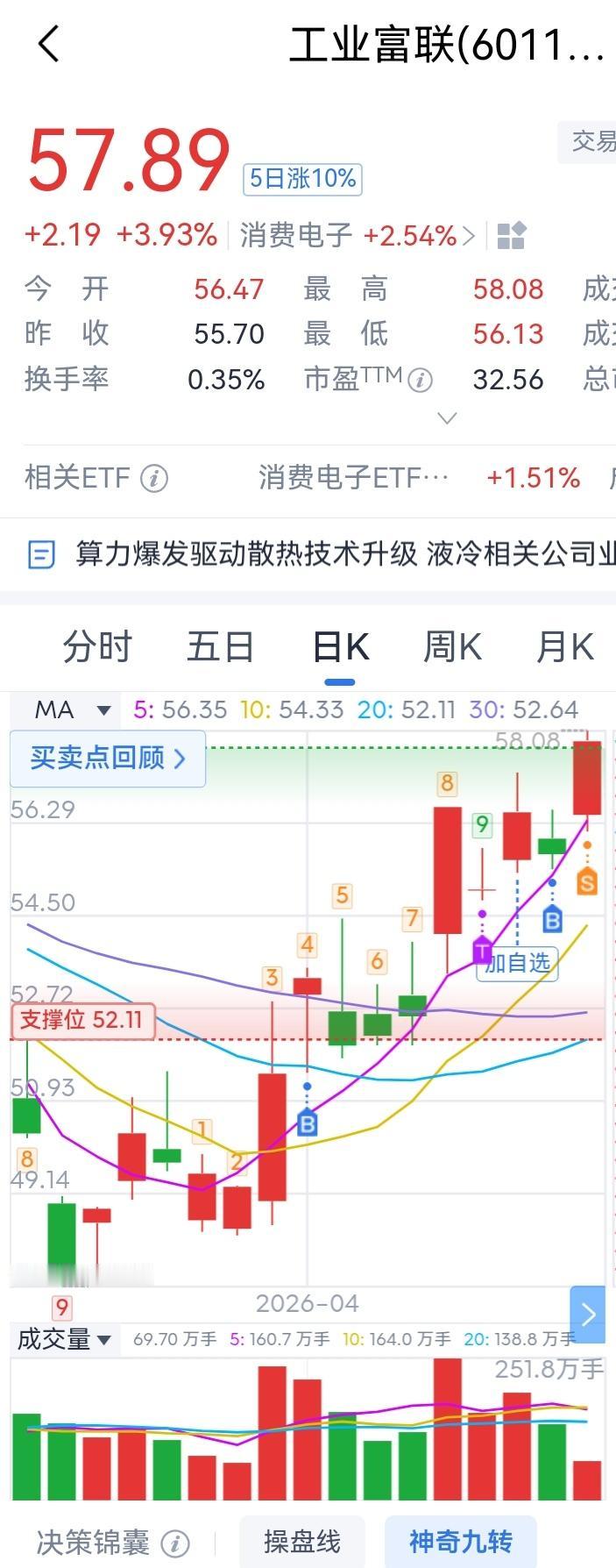 炒股新思路第三天!完美做T富联,成本降到50! 昨天55.6加仓的富联,今天在57.5元卖出!没有卖在最高的58元,但是不可惜!炒股不可能不能太贪! 2天收货5%,非常完美,成本从54元直接降到50元!现金90%!可以应付任何的调整风险! 为什么减?今天突破前期压力位,但是没有有效放量!换手率明显不足!10点钟明显看到大单大量流出!57.45-50是最安全减仓位置(昨天已经计算出来) 什么时候在加仓?等回调到5日线,即56.32附近 总结:昨天的调整非常的不充分,理论上应该在55.3元附近调整几天,洗掉不坚定筹码,再启动!但是主力太急,昨天洗,今天暴力拉,而且是缩量!有诱多嫌疑! 炒股第一原则:不亏!逢高减仓!由于本次调整太多疑问,下次加仓可适当降低,比如突破5日线至10日线之间! 也就是54.33-56.35,取平均值为55.34元! 以上为个人观点,高手别看,谢谢