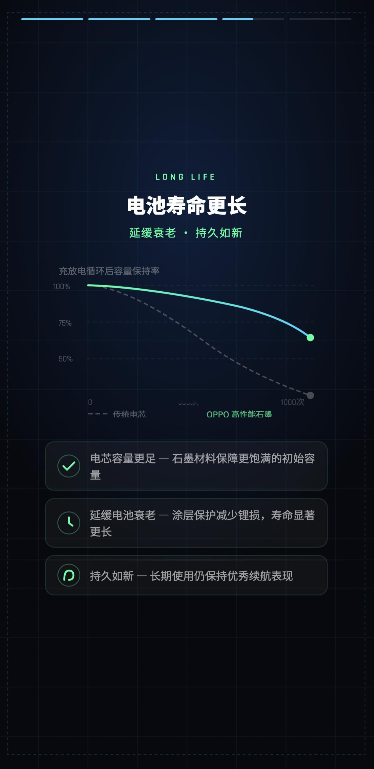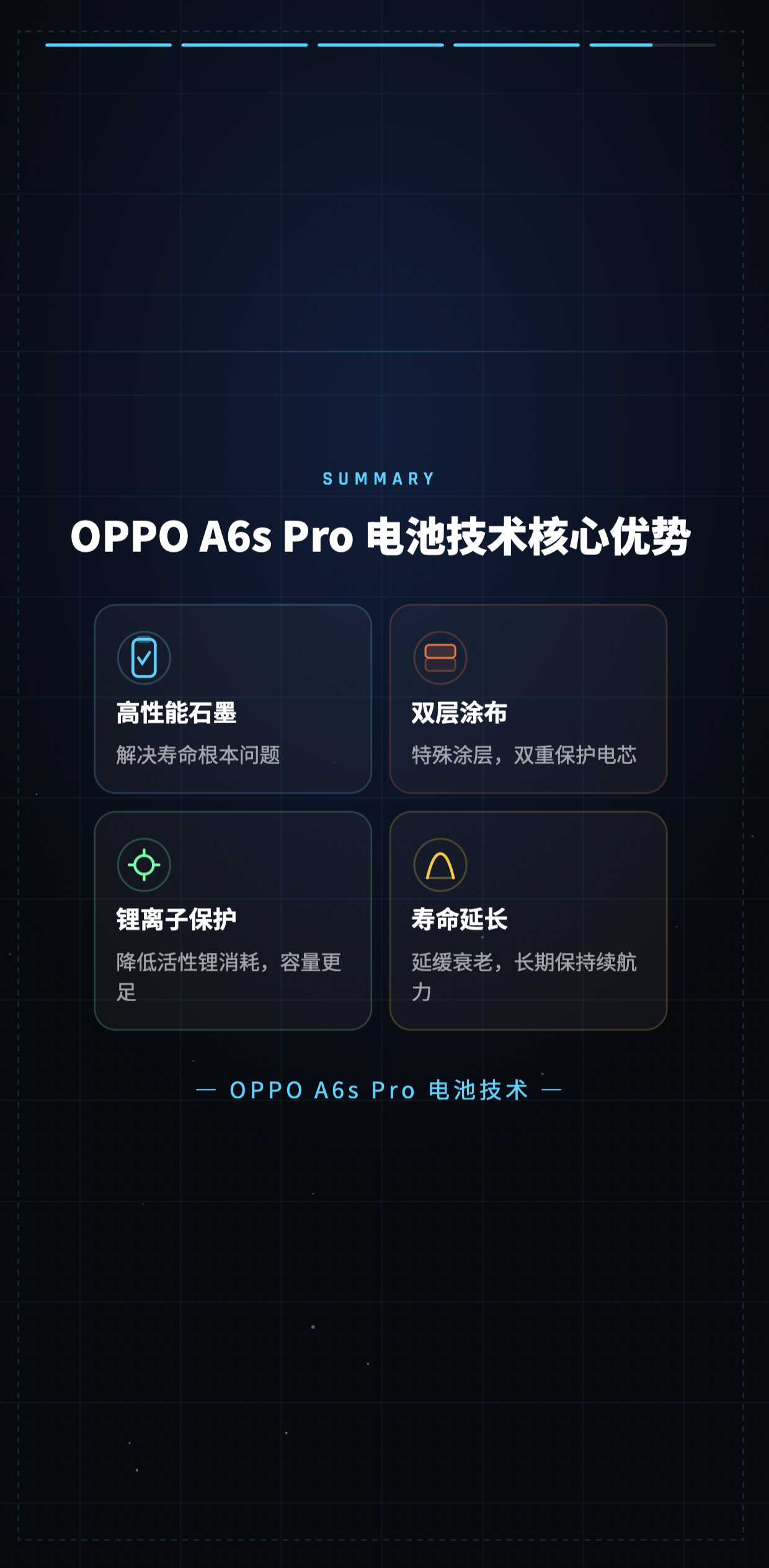 高性能石墨材料就平衡了传统石墨的低容问题和高硅电芯循环寿命的短板,电芯循环数据:高性能石墨电芯循环185次,电池健康99.57%,传统石墨循环50次,电池健康98.7%、高硅碳循环50次,电池健康95.7%。可见OPPO A6S Pro的高性能石墨电芯的配方做了升级,双层涂布降低活性锂离子消耗,多层负极结构让锂离子跑的更均匀更顺,双面隔膜给电芯穿了一层防护服,减少局部老化也更安全,预测高性能石墨电芯可以循环2000次+、依然可以保持高于80%以上的电池健康。