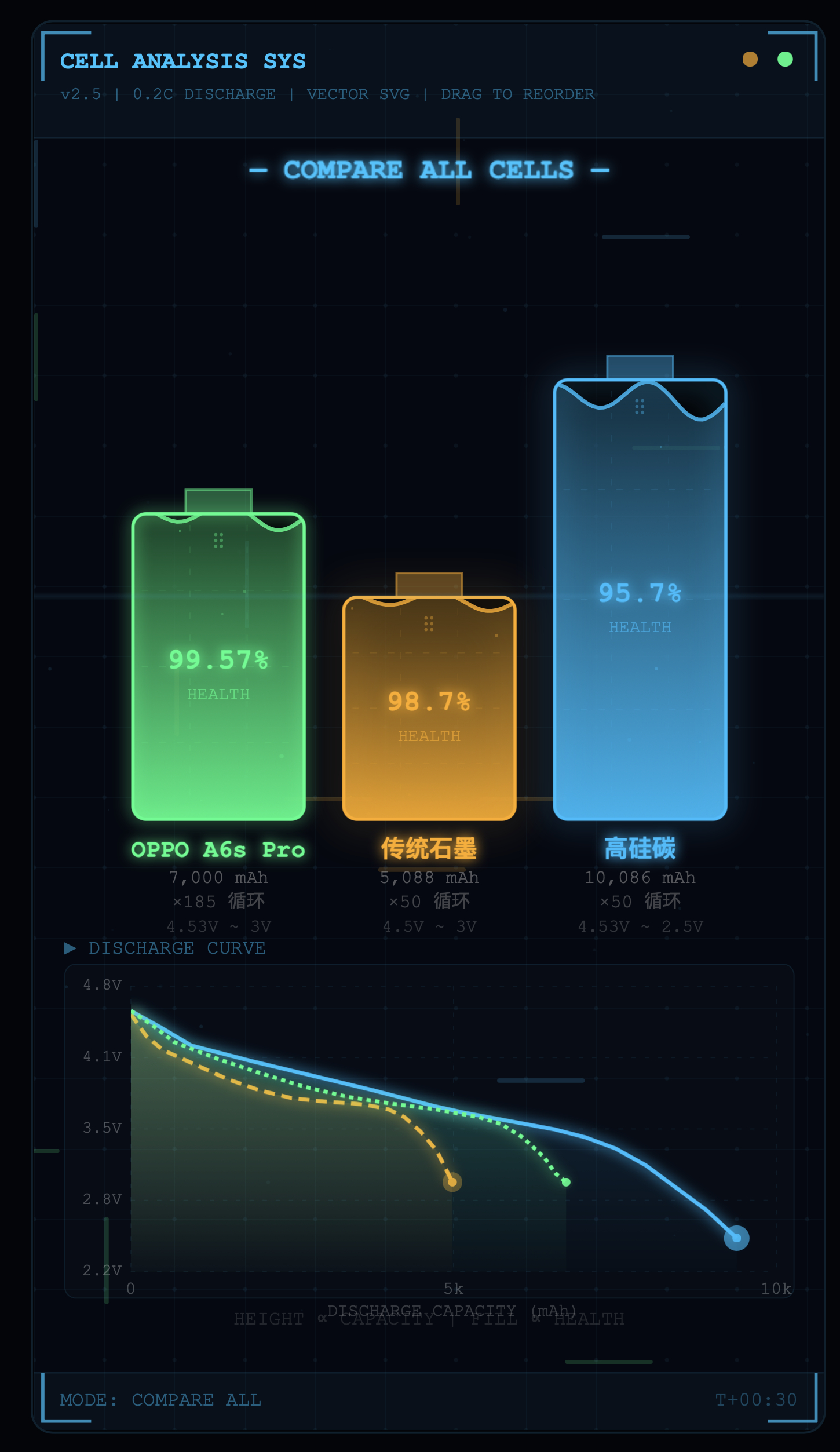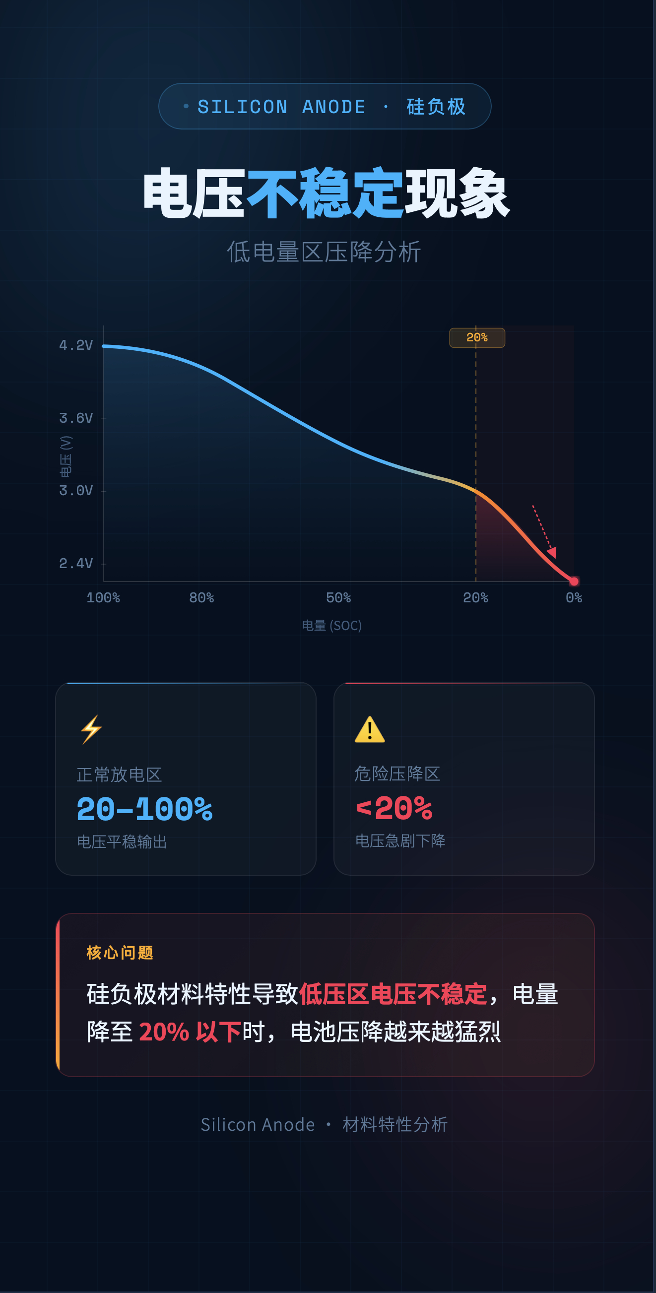 硅含量越高,电池越依赖使用条件,例如有膨胀问题,低电压不稳定问题,都是材料决定的,高硅碳电芯一般会做防猝死策略/锁容,防止低电压突然关机,所以会更保守,锁末端容量、 传统石墨电芯还是一如既往的稳定,但是容量会小一点,这也是为什么7000mAh-8000mAh可以挑战9000甚至一万的大电芯的原因,因为高硅碳比较依赖实用条件,特别是温控和压降问题。