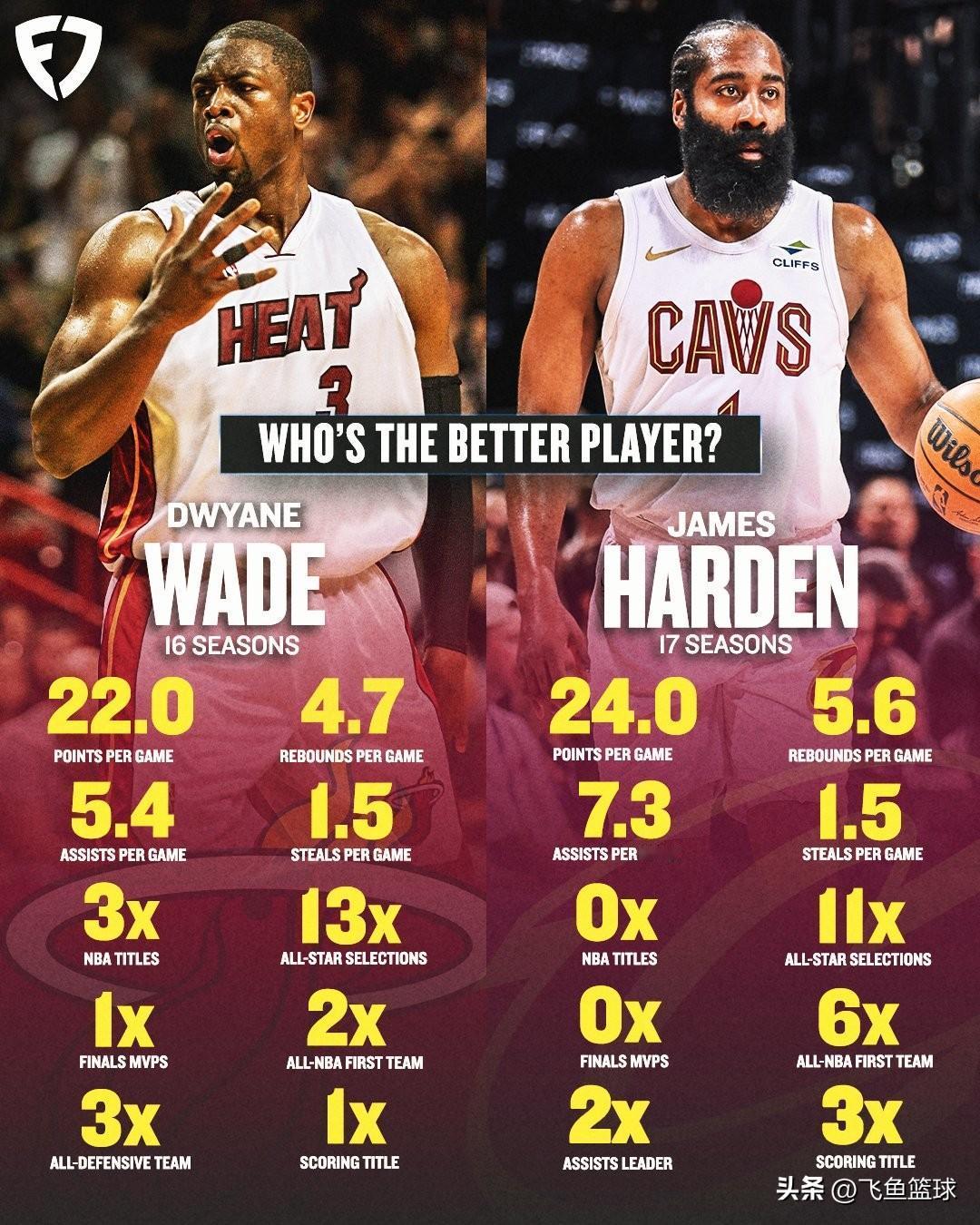 对还是错?✍️哈登大于韦德,前者比后者拥有更好的生涯? 德怀恩·韦德(16个赛季) 场均得分:22.0分 场均篮板:4.7个 场均助攻:5.4次 场均抢断:1.5次 NBA总冠军:3次 总决赛MVP:1次 全明星入选:13次 全NBA一阵:2次 全防守阵容:3次 得分王:1次 詹姆斯·哈登(17个赛季) 场均得分:24.0分 场均篮板:5.6个 场均助攻:7.3次 场均抢断:1.5次 NBA总冠军:0次 总决赛MVP:0次 全明星入选:11次 全NBA一阵:6次 助攻王:2次 得分王:3次