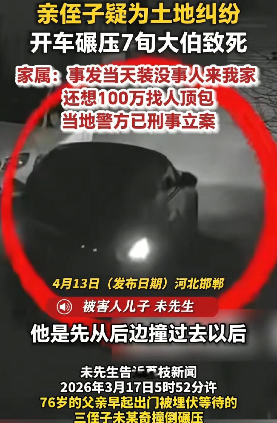 邯郸男子土地纠纷开车碾压70多岁亲大伯。据大伯儿子称,堂弟未某奇特意租的车,两家离得近,凌晨4点多蹲点守候,5点多从身后撞倒,又打方向盘碾压,肋骨断了10根。 起因租地租金,未某奇与哥哥在村里开螺丝生产厂,27年前借用外出打工大伯不种的2亩地,每年给2200元,现在大伯回村里要收回土地,或者按市场价一半给数万元租金(应该按照工业用地,土地征收补偿算的,提高了100多倍),双方没谈好起纠纷。 未某奇事后还上门像没事人一样,甚至打算花100万找人顶包,外逃石家庄又发生交通肇事被抓刑拘,哥哥涉案还在逃,大伯儿子诉求尽快抓获。 土地纠纷一直是农村的顽疾,导致了很多大小案件,不懂法不会沟通讲理是核心,该案还是一大家人内部,升米恩斗米仇,如今走到家破人亡这一步!再次警示世人,特别农村人! 以上来源于网络素材,仅供分享参考,引以为戒避免悲剧!具体详情以当地警方通报调查为准!关注后续!