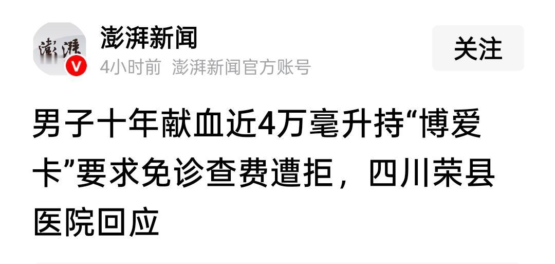 十年献血4万毫升,换不来几块钱的挂号费? 这话说出来都像段子,但它真真实实发生在四川自贡。 谢先生,无偿献血十年,109次,近4万毫升。什么概念?相当于把全身的血换了将近10遍。 两次全国无偿献血奉献金奖,手里拿着官方发的“博爱卡”,明文规定可以免公立医院普通门诊诊查费。 结果呢?在荣县人民医院,被人一句“不知道有这个政策”给怼回来了。 第一次去,好说歹说,院方勉强同意了一次。第二次去,干脆直接拒绝,连理由都懒得给。 最讽刺的是什么?谢先生怕人家不知道,第一次被拒后,专门打电话去医院办公室,把政策文号、发文单位、时间,一字一句说得清清楚楚。 相当于把饭喂到嘴边了。结果4月11日再去,还是不行。医院4月13日回应了:内部政策学习不到位,会整改。 我就想问一句:几个月时间,学不会一个政策? 第一次被拒是2月,谢先生还专程打电话提醒过。到4月第二次被拒,中间隔了整整两个月。 这两个月,医院在干嘛?文件在抽屉里睡觉?还是压根没人把这事当回事?说穿了,不是学不会,是没想学。 在很多人眼里,献血者那点权益算什么?几块钱的挂号费,也值得我翻文件?但问题恰恰就在这里。 政策从省里发到市里,从市里发到县里,从县里发到医院,层层下发,最后卡在窗口那一句“不知道”上。 那请问,发文件的意義在哪?献血的承诺还有几分可信? 让人献血的时候,口号喊得震天响,“致敬无偿献血者”“你们的奉献我们铭记在心”。等人家真来享受权益了,脸一板:没听说过。 这叫什么?叫过河拆桥,叫卸磨杀驴。更让人寒心的是,这不是个例。 翻翻新闻,西安的吕先生献血57次,去景区想免费,被要求买票,最后气得打官司。 几十块钱的事,谁打官司是为了钱?为的是那口气,为的是政策不能成废纸。 谢先生说得直白:不是在乎那几块钱挂号费,是合法权益被无视,寒心。对,就是寒心这两个字。你让好人寒了心,下次谁还愿意做好事? 献血车停在街边,本来就没多少人主动去。好不容易有谢先生这样的“铁杆”坚持十年,结果连最基本的尊重都得不到。 这不是在谢先生一个人身上踩一脚,这是在所有潜在的献血者面前,把政府的公信力往地上摔。 荣县人民医院说“会整改”。我信,但我更想看结果。 怎么整改?是给窗口贴一张纸“持有博爱卡可免挂号费”?还是全员培训、纳入考核、建立投诉机制? 话说回来,这类问题屡禁不止,根子在哪?根子在“不在乎”。 因为拒绝一个献血者,医院没有任何损失。没人扣绩效,没人问责,最多发个声明“学习不到位”就过去了。 而献血者呢?为了几块钱挂号费,投诉无门,最后只能上网曝光,成本天差地别。 所以,真正要改的,不是一张纸、一句口号。是要让每一个窗口工作人员知道:你敢拿“不知道”当挡箭牌,就要承担后果。 是要让每一家公立医院明白:政策不是摆设,你不执行,就有人让你执行。 谢先生这十年,献的是血,也是人心。别让好心人寒了心。支持的转起来,让更多人看见!