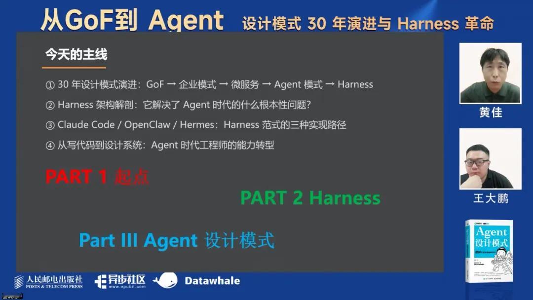 从 GoF 到 Agent设计模式 -- 30年演进与Harness 革命网页链接“新加坡科研机构AI研究员、《动手做AI Agent》、《Agent设计模式》作者黄佳在Datawhale带来了一场关于 Agent Harness 的深度分享。在 2026 年,当大模型能力进入高原期,Harness 正在成为决定 Agent 系统成败的关键。Claude Code 的崛起、DeepMind 的实验验证、Hermes 的创新,都在证明一个事实:Harness 是战略级别的资产。”How I AI
