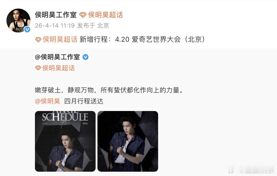 侯明昊确认出席爱奇艺世界大会 据工作室同步日程,侯明昊确认将于4.20携《雀骨》《碧血蝉》两部待播剧出席爱奇艺世界大会。