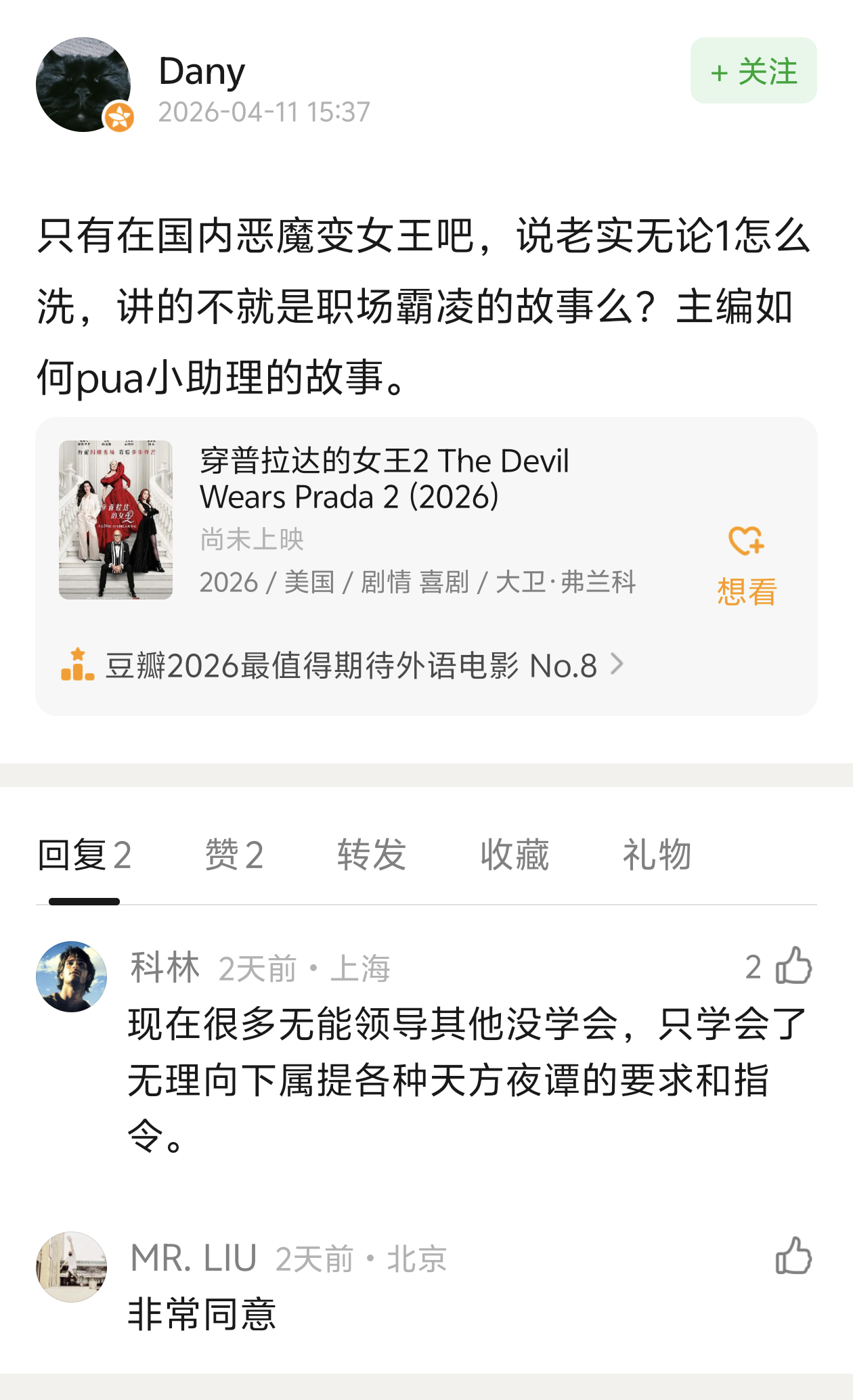 笑死我了还洗地呢……其实是全球只有减重这个地方对这个片子理解跟着重点是职场pua,我们这牛马的一生啊。也只有这个地方真把米兰达当反派看你跟他们说这电影除减重外,最爆的角色是米兰达,并且已经是流行文化icon式的角色,这部电影20年持续有影响力靠的是米兰达的经典场面跟台词,渗入社媒跟大家生活中。他们可能会觉得匪夷所思 。